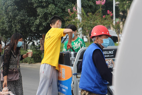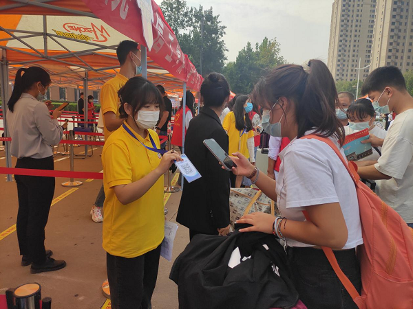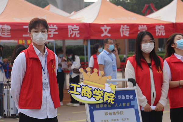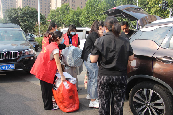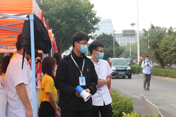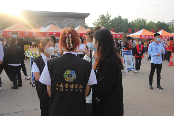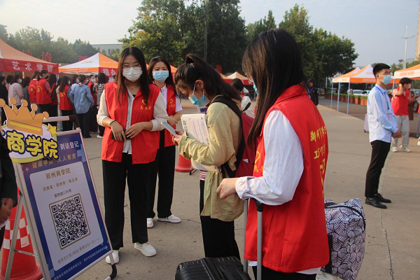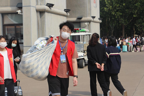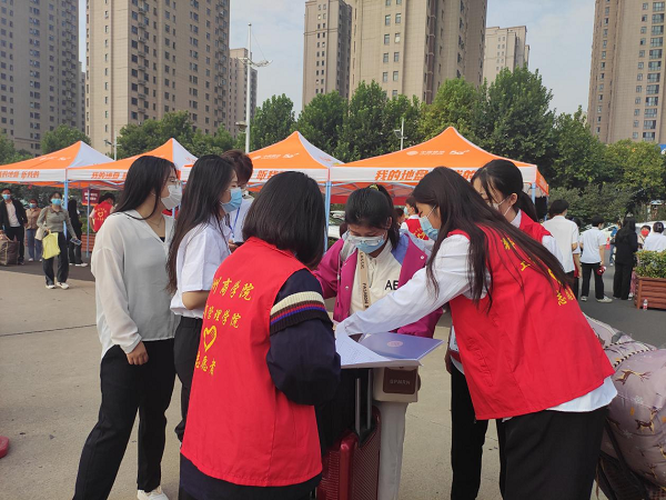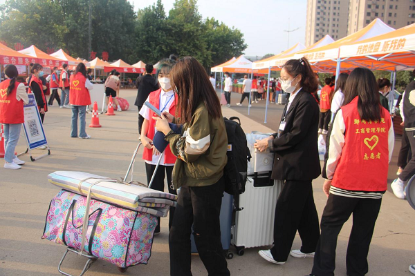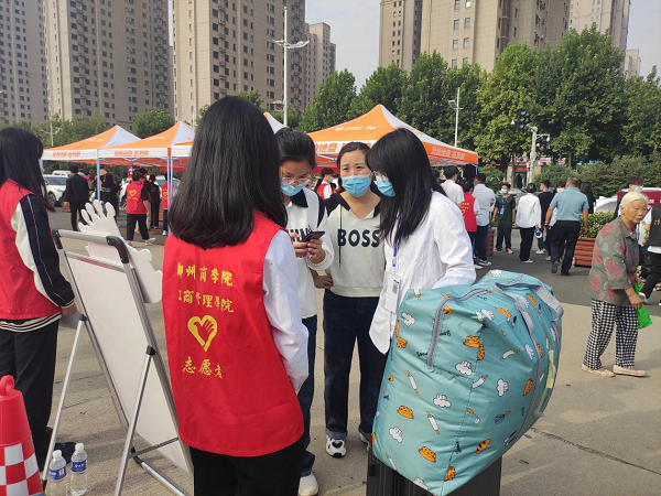 志愿者和工作人员各司其职、分工合作,按照“一对一对接”原则,确保新生一到学校大门就“有人接、有人管”帮助新生运送行李,服务好从校门口到我院服务站的距离,以高度的责任心和饱满的热情,让止步于校门外的家长们感到安心、放心。