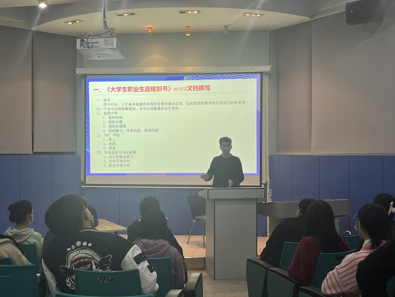 随后他通过自身经历,向同学们讲解了职业生涯规划大赛PPT制作的技巧和路演中的注意事项,并讲到:青年大学生在职业规划上应坚持把个人理想放到国家发展大局中进行思考和定位,将个人职业发展同社会发展紧密融合,实现个人价值与社会价值的协调统一。