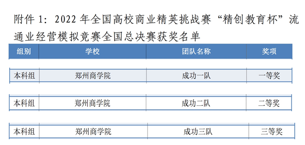 由中国国际贸易促进委员会商业行业委员会、中国国际商会商业行业商会、中国商业经济学会主办,浙江精创教育科技有限公司提供技术支持的2022年全国高校商业精英挑战赛流通业经营模拟竞赛全国总决赛,于2022年11月5日顺利举行,因疫情影响本次比赛全程线上进行。在杨松柏院长、黄信恒老师、吴阳阳老师、宁卫杰老师的指导下,经过前期区域赛的激烈对抗后,我院三支队伍脱颖而出成功挺进了全国总决赛。在全国总决赛中,来自郑州大学、福州大学、广西大学、江苏大学、石河子大学、苏州科技大学、安徽财经大学等三百多所高校同台竞技,我院三支代表队以优异的成绩分别荣获全国一等奖、二等奖、三等奖。