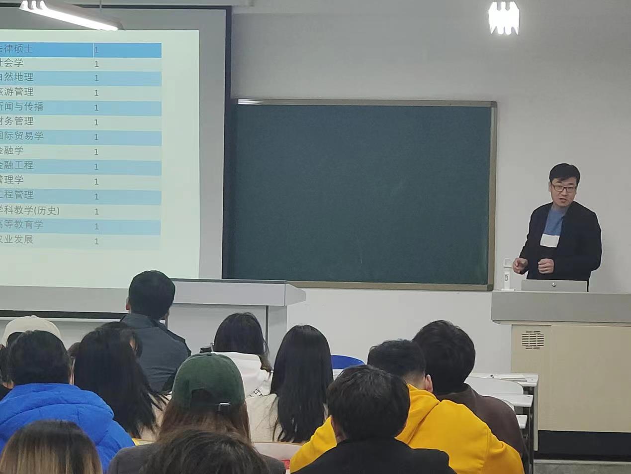 随后,李鸿春老师从两个大方面和学生展开了交流。李老师真挚地告诉大家:学习很苦,考研很苦,但结果一定会很甜,用一年的努力换来未来的美好生活,非常值得!然后李主任通过18级、19级学生考研的实际情况来为学生进行考研形势分析,希望通过展示往届学生的考研择校、择专业以及升学情况,帮助学生解开目前关于考研存在的疑惑并逐渐明确自己的考研目标与努力方向。