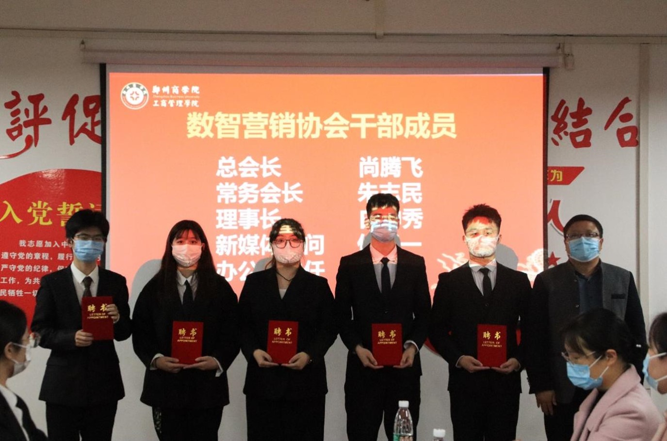 接着,杨院长、张副院长及各位指导老师向同学代表颁发协会干部任职聘书及营销之道省赛一等奖二等奖证书。协会会长尚腾飞介绍协会组织架构、内容、会徽与会旗等。