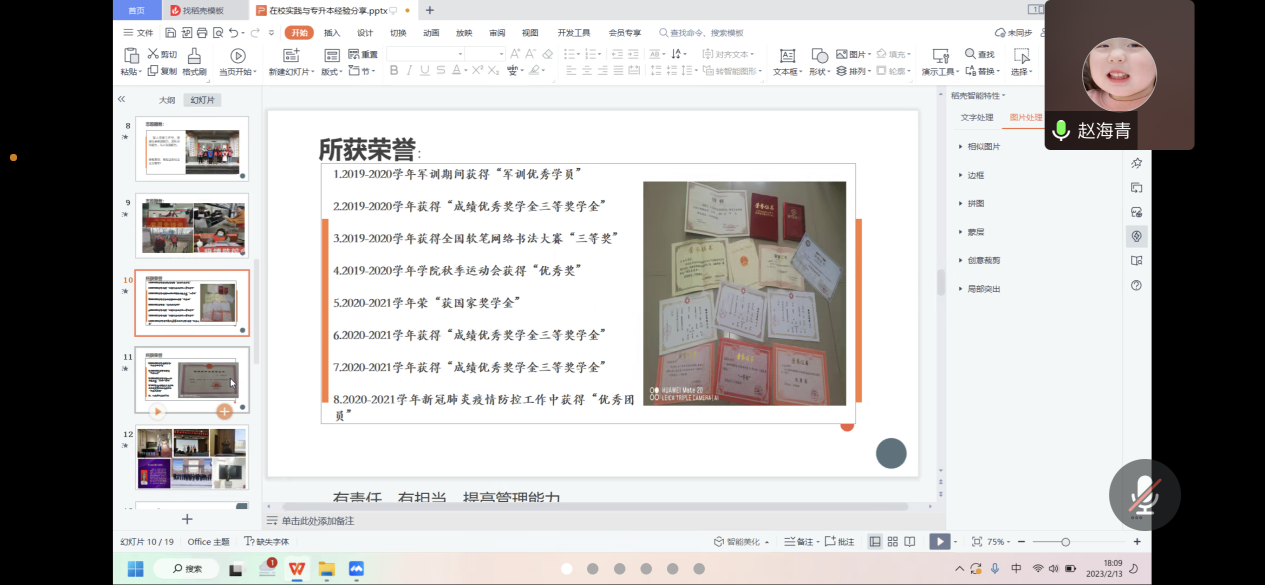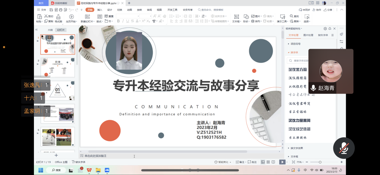 为引导大学生提前规划大学学习生活,帮助大学生正确认识自我以及提高就业能力,更好地落实“稳就业、保就业”的全面部署,促进学生对专升本有更详细的了解,激发学生积极主动性,2月13日晚,我院召开线上专升本经验分享会,邀请我院2022届优秀毕业生赵海青担任主讲。