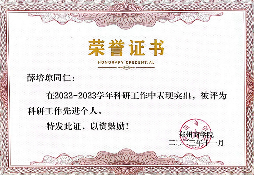学期初吴校长在教职工大会上指出“提质增效、强化应用,全面提升科研服务能力”。学校对科研的重视和支持,让全体教职工意识到科研的重要性,也让科研的种子在薛老师心中生根发芽。2022-2023第二学期,薛老师教学任务繁重,负责多位学生毕业论文的定稿、答辩和归档材料工作,同时还兼任学院试卷专项。4月16日晚上,刚在武汉结束历时三天的科研研讨会,十点多才进家门,尽管已经身心俱疲,尽管第二天还有满满的一周实训课,但是他依然折返到办公室,用三天的学习心得完善修改河南省教育厅人文社科申报书,一直到凌晨三点才在截止日期内提交申报。在如此巨大的工作量下,他始终坚持不懈,只要有名额,就绝不错过任何一个申报机会。本学期完成申报了8个项目,立项河南省教育厅重点科研一项,河南省教育厅人文社科一项,河南省社科联课题一项,郑州兴文化工程文化研究专项一项,河南省民办教育协会课题一项,taptap点点校级教改重点课题一项。同时还荣获河南省社科联一等奖一项,河南省民办教育协会一等奖一项。