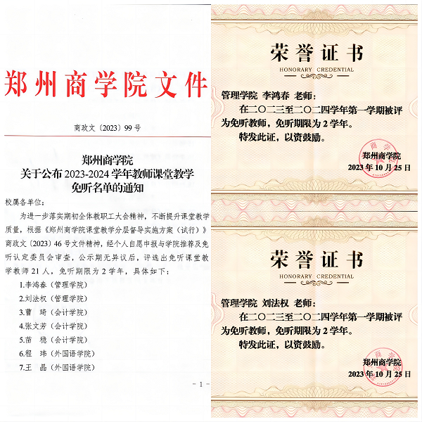 李鸿春、刘法权老师课堂教学免听证书及红头