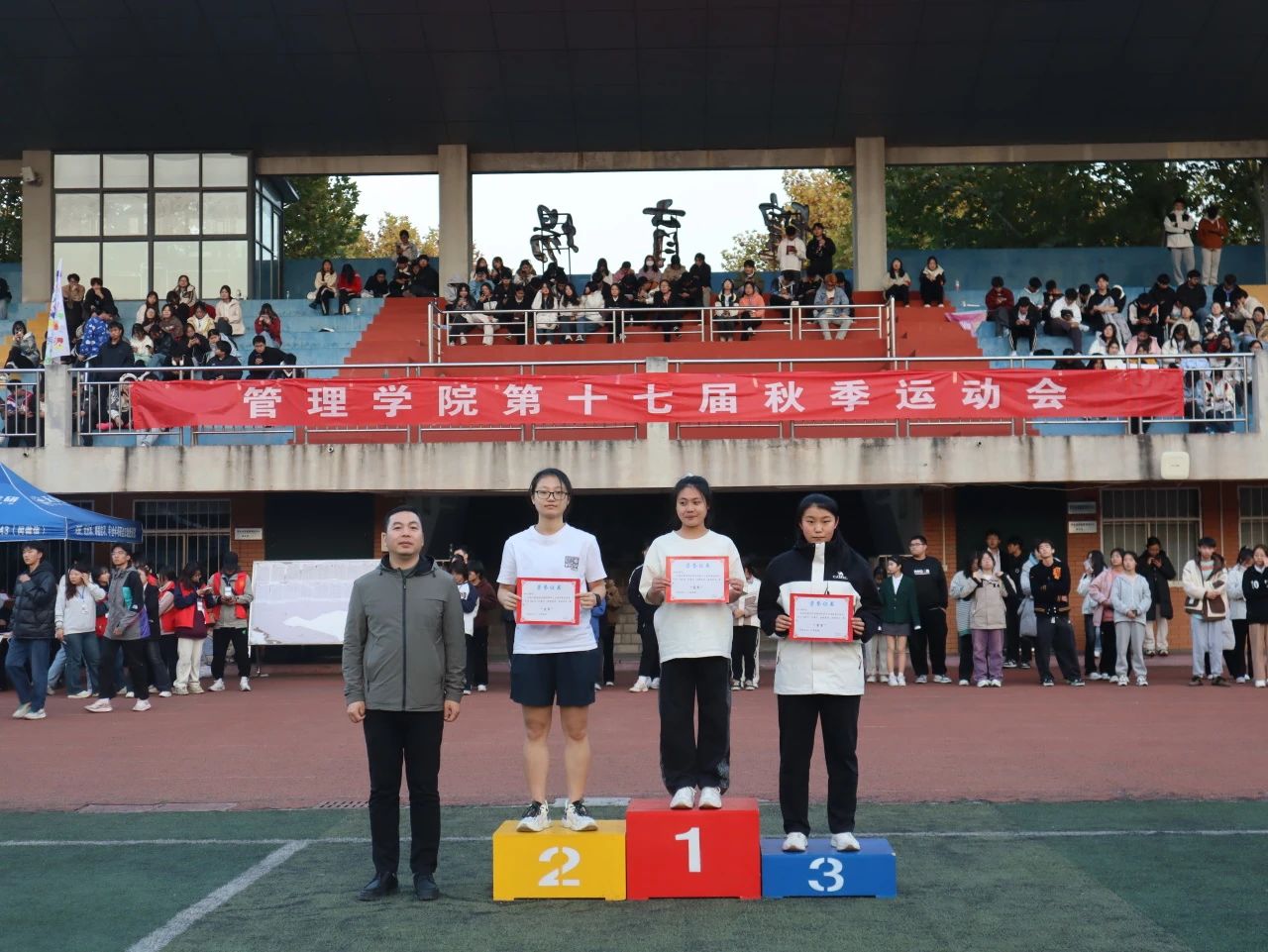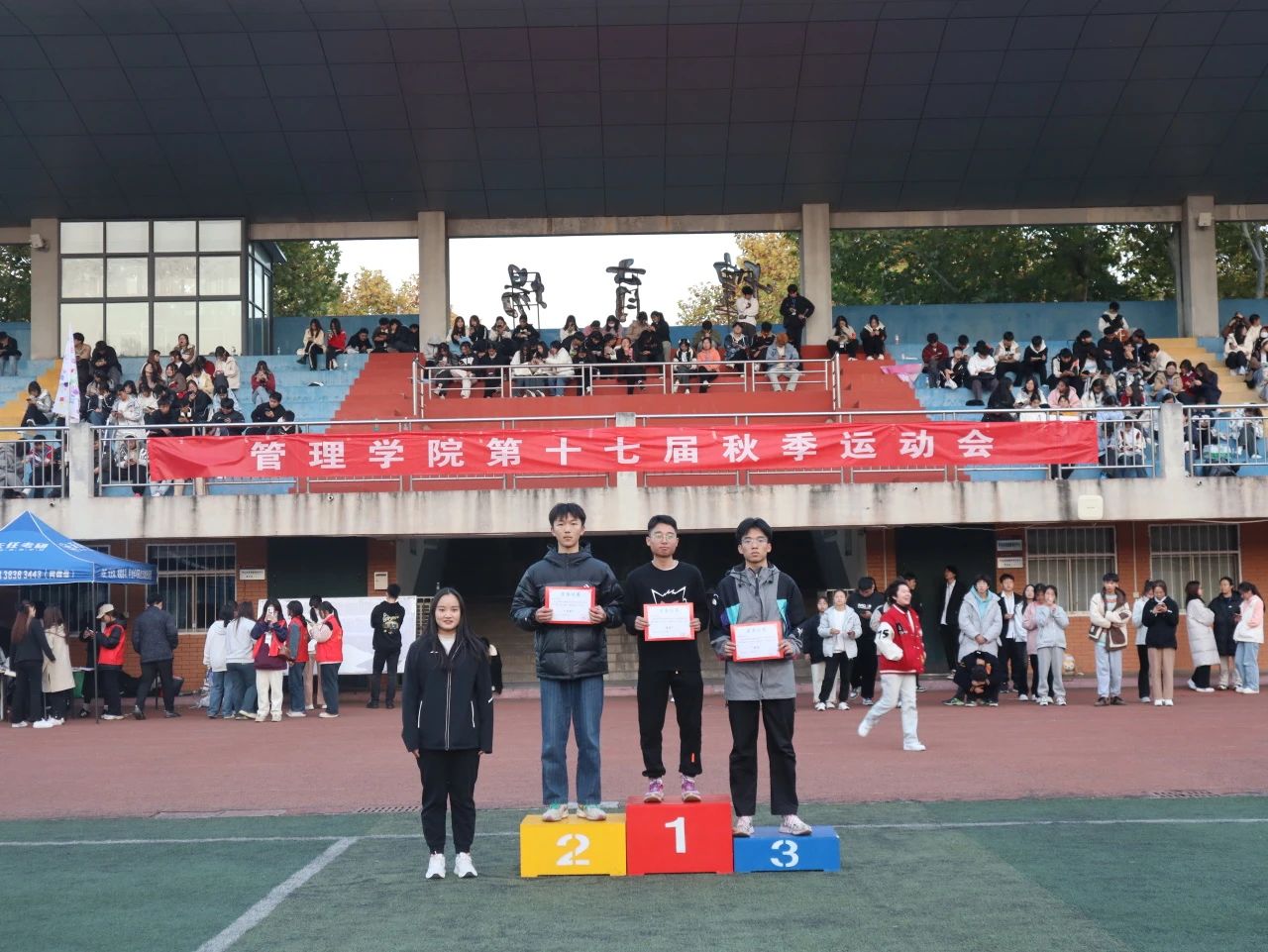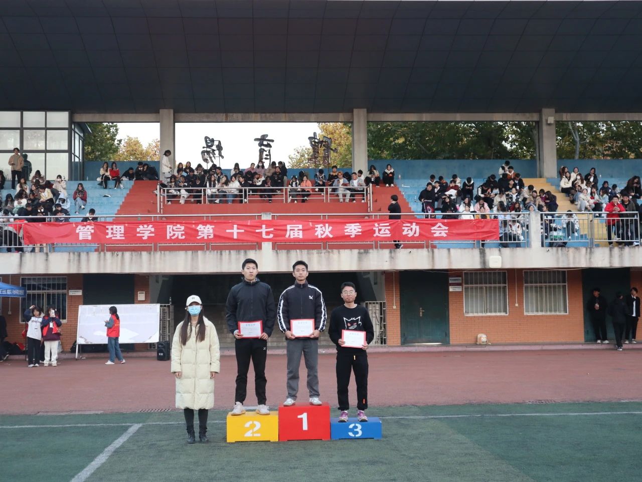 泪水与挫折交融,汗水和微笑相拥,经历了一整天的激烈比赛之后,迎来了本次运动会的闭幕式。学院领导们为取得优异成绩的运动员以及班级团体颁奖。最后,我院领导宣布管理学院第十七届秋季运动会到此结束。