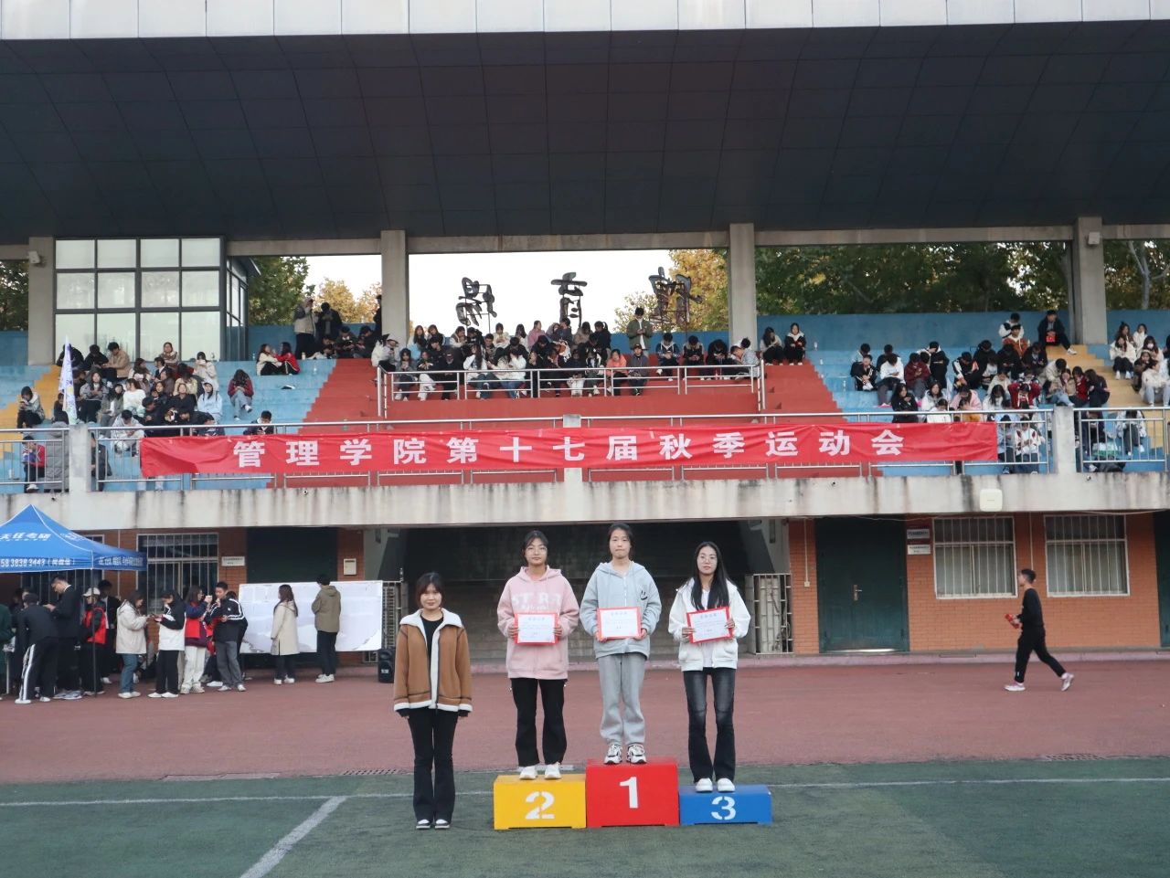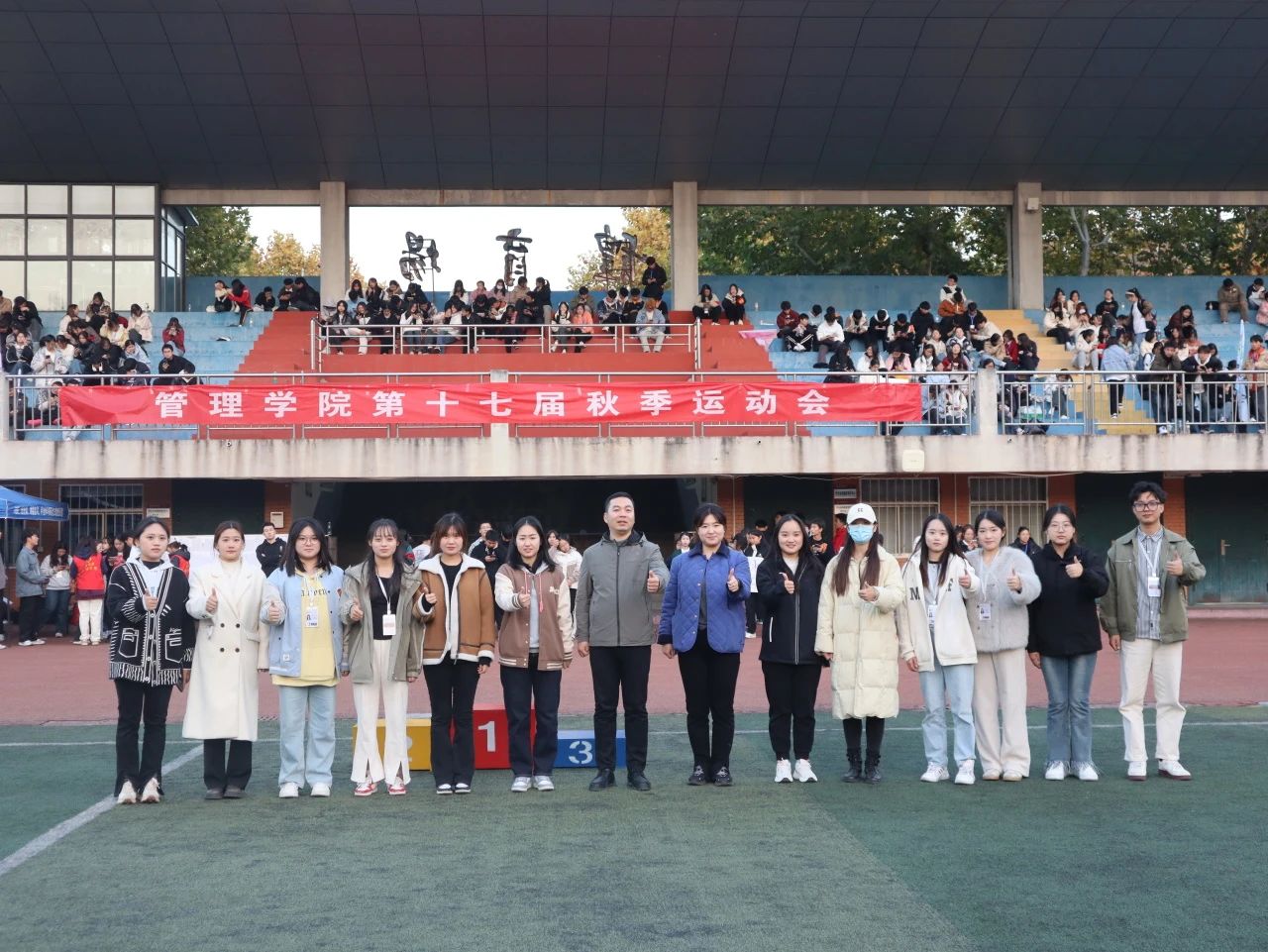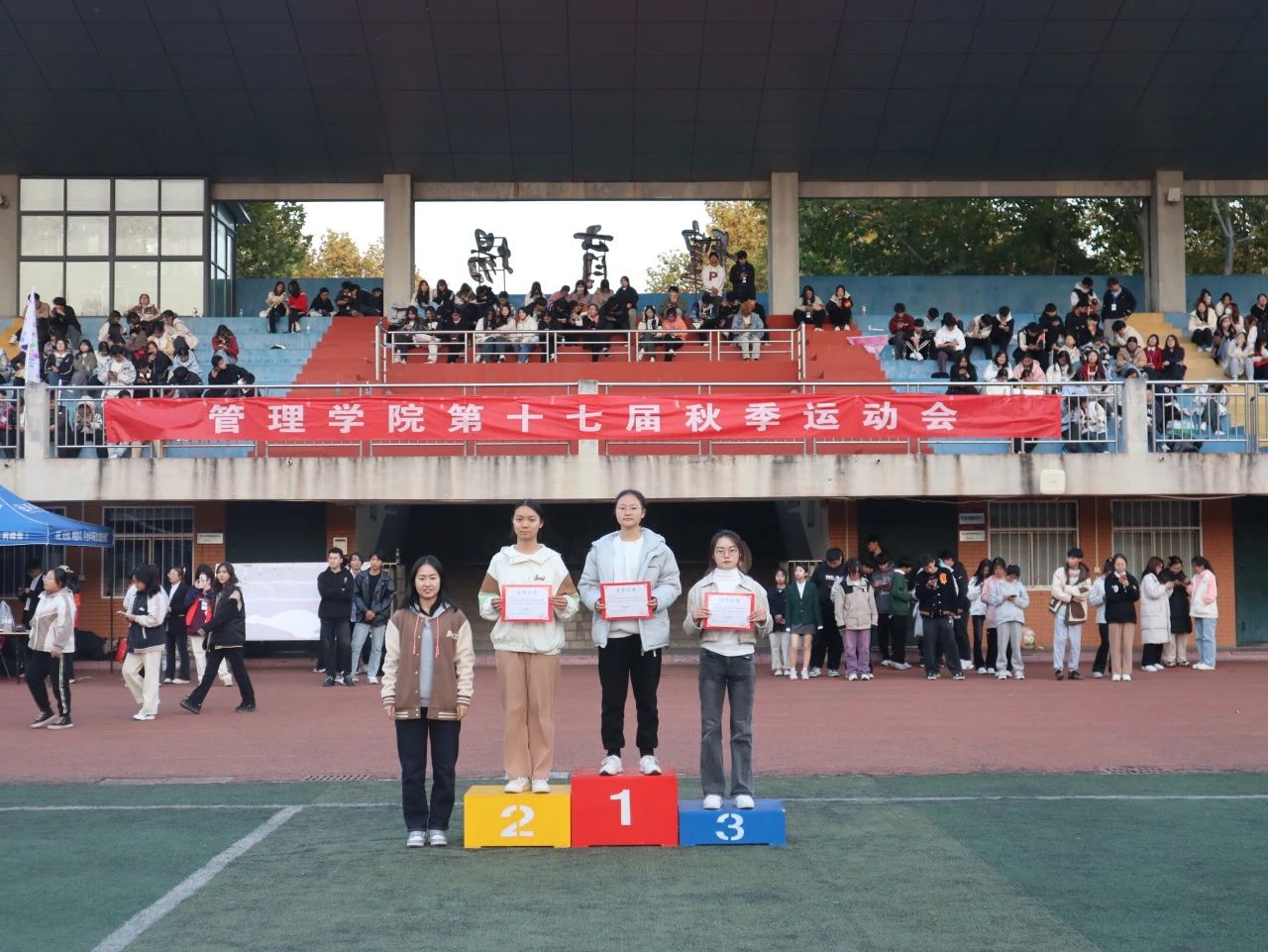 泪水与挫折交融,汗水和微笑相拥,经历了一整天的激烈比赛之后,迎来了本次运动会的闭幕式。学院领导们为取得优异成绩的运动员以及班级团体颁奖。最后,我院领导宣布管理学院第十七届秋季运动会到此结束。