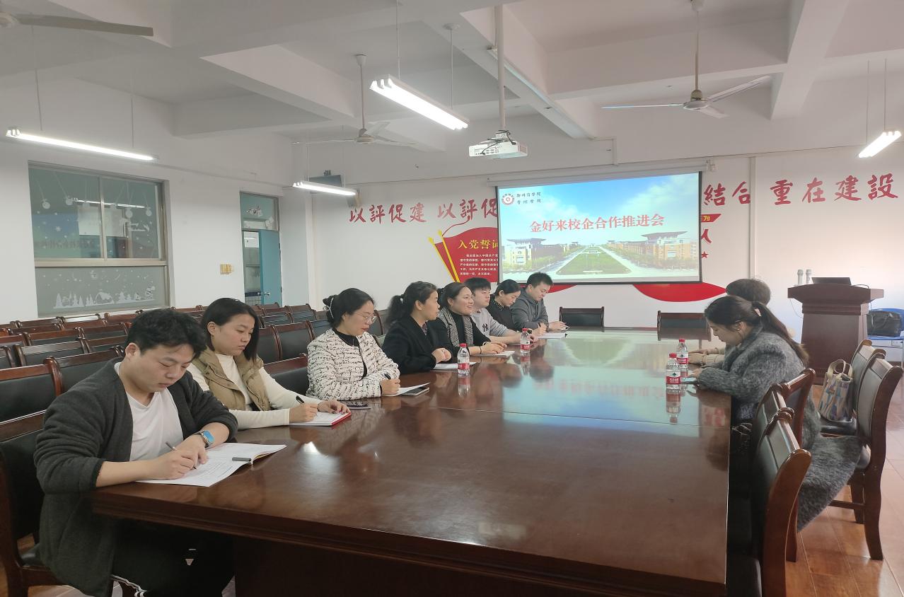 会议伊始,张卫丽副院长致辞,介绍了学院发展现状以及开展校企合作的经验,指出了学院开展校企合作的优势,肯定和强调了开展定制班的重要性和必要性,希望校企双方能坚持优势互补和机制创新,以产业需求为导向,为地域经济的服务与地方人才培养体系的完善开辟新道路。随后,杨总对金好来目前的产业布局、发展计划以及此次定制班的培养方案进行了详细介绍,她表示将充分利用企业现有资源,为学生提供实践平台,激发他们的积极性,提高学生的实践能力,期待未来能够与学院加强合作,探索产学融合发展新模式,携手并进,促进双赢的局面。最后,张玲燕主任就具体的合作细节与企业代表进行了深入的沟通与洽谈,在交流中,双方初步形成了定制班的培训形式,旨在更系统地使学生掌握商业运作流程,将学校知识有效应用到实践中,提高岗位胜任力。此次会议为双方全面合作奠定坚实基础,期待未来能够取得更丰硕的合作成果。