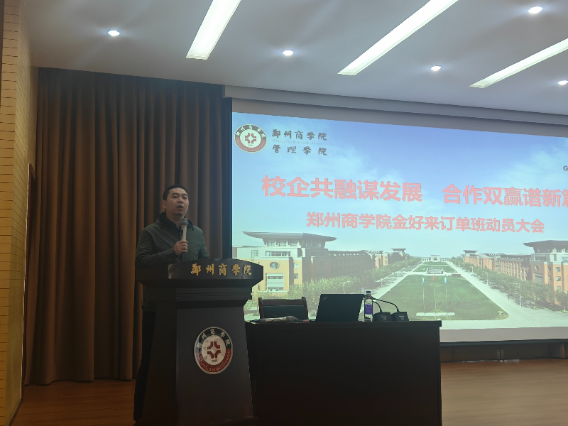管理学院院长杨松柏回顾了与河南金好来公司合作历程,向同学们介绍了历届金好来订单班培养情况,并结合当下经济形势分析未来的就业形势,阐述了订单班在应用型人才培养中的重要性,希望同学们能够珍惜学习机会,在实践工作岗位上有所收获。同时杨院长也表达了希望与金好来公司建立长效合作机制、实现优势互补,促进学院人才培养模式的创新与发展。