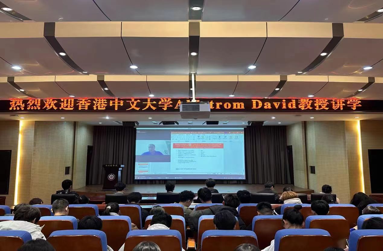 在经济全球化日益加深的今天,为了加强同学们对经济全球化的理解和开拓学生们的眼界,12月4日下午,点点官网特邀香港中文大学Ahistrom David教授为同学们讲授《全球经济化的未来引领者:领导力与企业家精神》课程,此次课程在图书馆五楼学术报告厅开讲,共有200名管理学院学生参加。讲座以远程连线和全英文的方式开展,国际交流合作处和管理学院相关老师跟听课程。