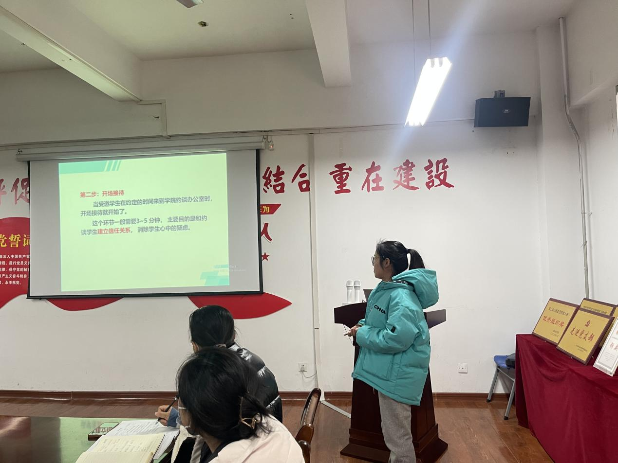 为了加强辅导员队伍建设,增强辅导员与学生进行心理约谈及心理问题识别技巧。12月14日,管理学院邀请心理健康中心黄静静老师于2号教学楼二楼会议室开展“以心理约谈及心理问题识别技巧”为主题的专项指导会议。我院团委书记魏瑶及全体辅导员参加了此次会议。