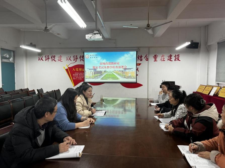 为确保学期末教研室教学以及考试工作井然有序进行,及时发现和解决教学工作中存在的问题,12月20日,市场营销教研室在2206召开期末考试及教学检查部署会议,会议由市场营销教研室主任张玲燕主持,全体教研室老师参加了本次会议。
