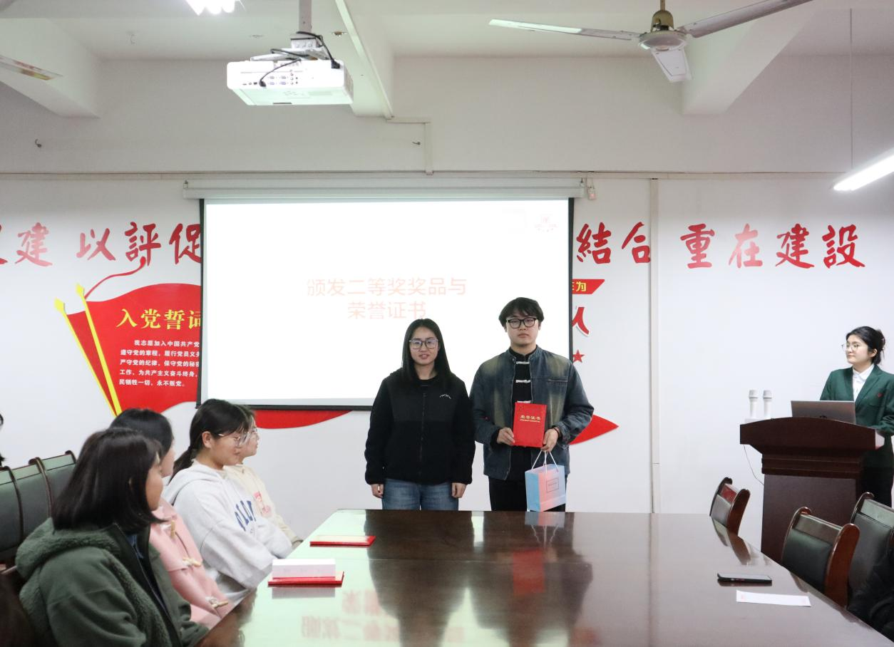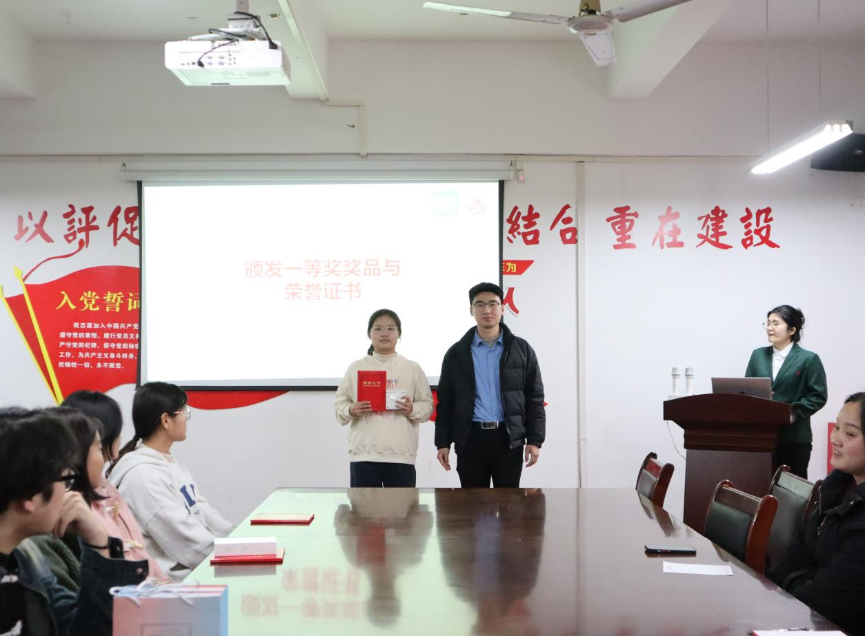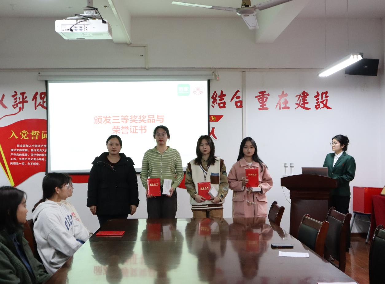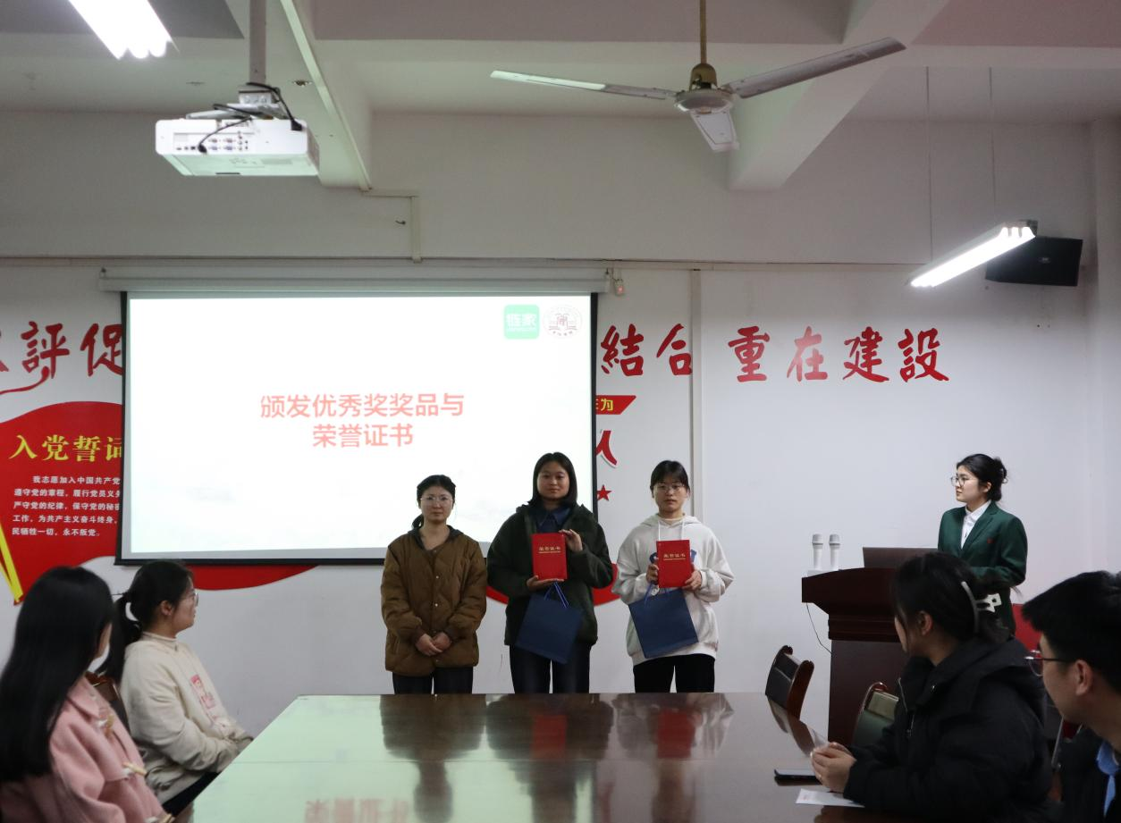 会上,本次活动的指导老师张逸凡对优秀选手进行了表扬并阐明了比赛的意义。随后进入颁奖环节,由聂丝语老师为优秀奖获得者颁发荣誉证书和奖品;由遆瑞娇老师为三等奖获得者颁发荣誉证书和奖品;由李雪艳老师为二等奖获得者颁发荣誉证书和奖品;由张逸凡老师为一等奖获得者颁发颁发荣誉证书和奖品。在本次大赛中,选手们通过精心准备和出色表现,成功获得了评委们的认可。