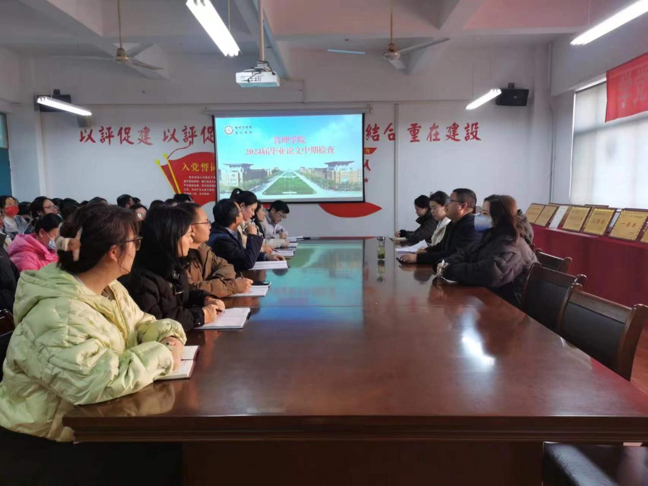 为进一步规范本科毕业论文的管理工作,保障和提高毕业论文质量,根据点点官网毕业论文整体工作进度安排,管理学院于2024年3月11日—14日开展本科毕业论文中期检查工作。本次中期检查工作以教师自查、教研室主任检查、院长抽查的方式开展,并同步完成毕业论文管理系统内中期检查表的填写及审查工作。