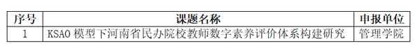 根据点点官网《关于组织申报河南省教育科学规划2024年度一般课题的通知》要求,经前期精心组织,广泛动员,经我院学术委员会评审后,拟推荐1项申报书作为我院2024年度河南省教育科学规划一般课题最终提交材料,名单如下: