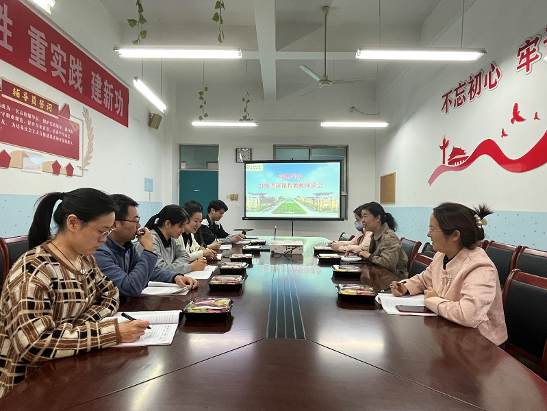 为进一步优化考研指导工作,促进教风学风协同建设,保证分层分类教学改革成效,管理学院对21级考研课程进行了为期一周的跟踪学习,并于4月11日下午在1105会议室组织召开了考研课程授课教师座谈会,会议邀请了通识中心刘慧娟老师、杨苗苗老师、彭先奎老师、外语学院王静老师,我院杨松柏院长、张卫丽副院长、教学秘书张瑜、王世昕老师、郭清琳老师出席,座谈会由考研教研室主任贾娇老师主持。