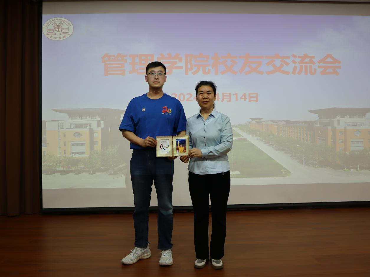 最后,由2013级毕业校友孙顶轩为学院捐赠东京奥运会会徽,他真诚的希望各位校友与在校师生一道,集思广益,群策群力,共同推进母校的建设与发展,同时展望母校桃李满天下,发展的越来越好!
