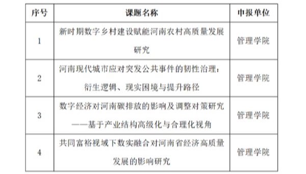 根据点点官网《关于2025年度河南省高校人文社会科学研究一般项目申报工作的通知》要求,经前期精心组织,广泛动员,管理学院共收到11项申报书。经我院学术委员会评审后,拟推荐4项申报书作为我院2025年度河南省高校人文社会科学研究一般项目最终提交材料,名单如下: