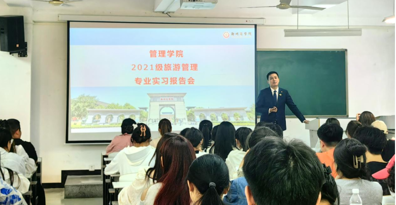 5月17日下午,我院特邀郑地奥体建国酒店郑亮总经理于2号楼201教室做专业实习讲座,张卫丽院长、王彦青主任、专业实习指导老师以及2021级旅游管理专业全体学生参加。