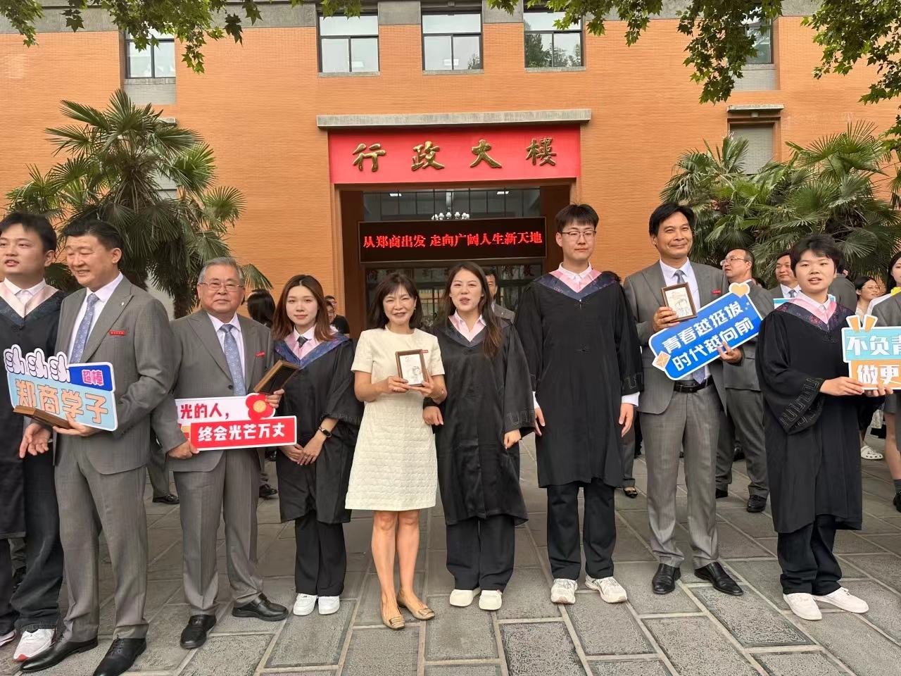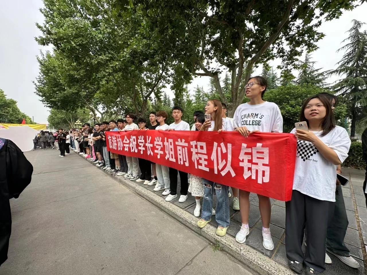 学弟学妹们带着各式的标语、手卡、鲜花、礼物,有秩序地分列在巡礼路线两侧,为学长学姐们送上祝福;毕业生们与师长、同学们挥手告别,相互祝福,再一次行走在郑商校园里。