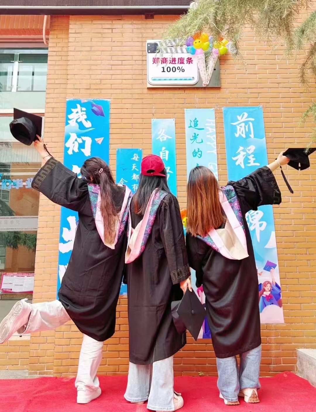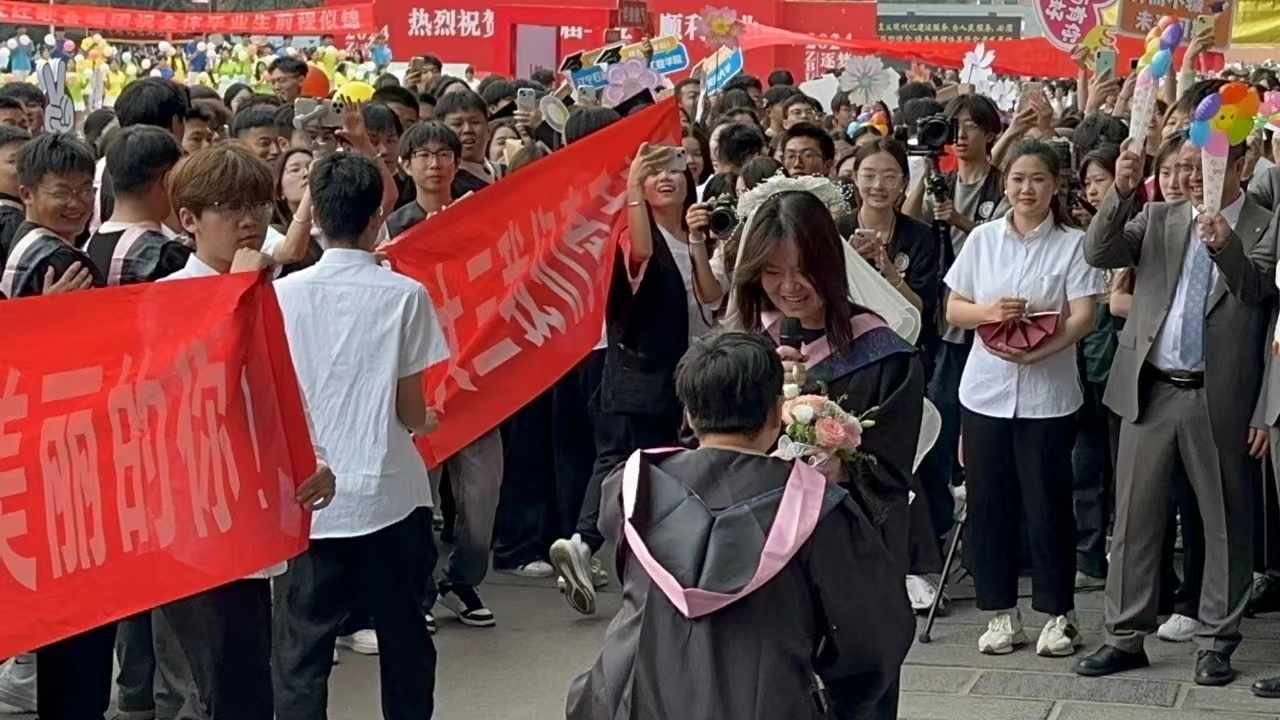 学院门口放置以管理学院全体毕业生姓名组成的“我爱管理”喷绘;电子屏播出“祝2024届毕业生毕业快乐”定制的“怀梦想,致远方”“主打一个快乐毕业”等KT板,各种美好的祝愿条幅在观礼区域飘扬,气球、卡纸、加油棒等道具更渲染出一种毕业的氛围。