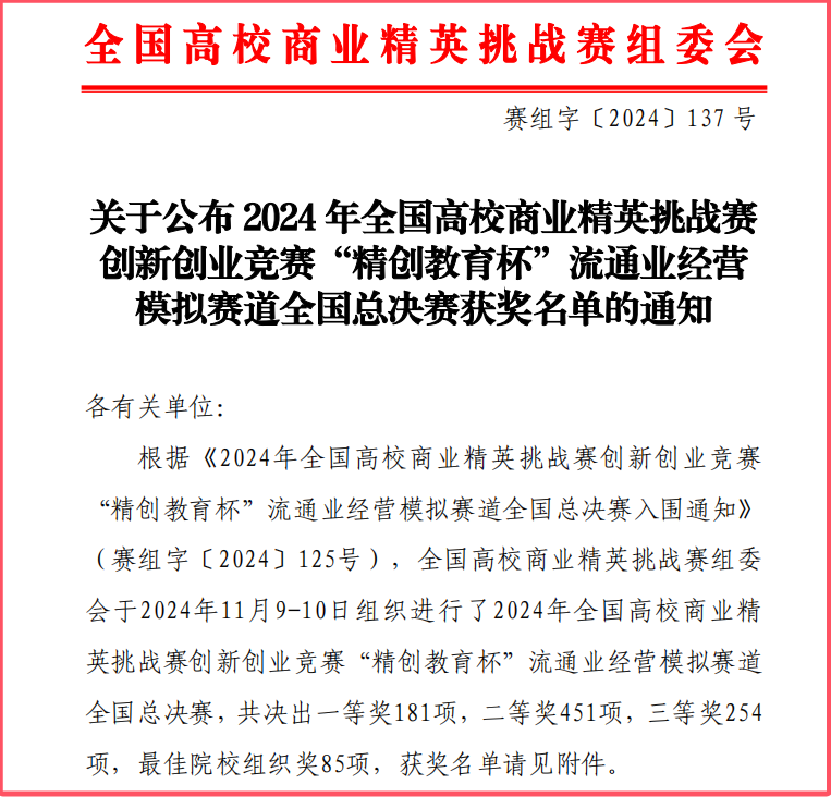 11月13日,由中国贸促会商业行业委员会、中国国际商会商业行业商会、中国商业经济学会主办的2024年全国高校商业精英挑战赛创新创业竞赛流通业经营模拟赛道全国总决赛圆满落幕。经过知识赛、校赛、区域赛的激烈角逐,我院由工商管理、市场营销等专业学生组成的九支代表队,在指导老师张玲燕、陈茜、吴阳阳、宁卫杰的带领下,取得国赛一等奖2项、二等奖5项、三等奖2项的优异成绩,点点官网荣获最佳院校组织奖。