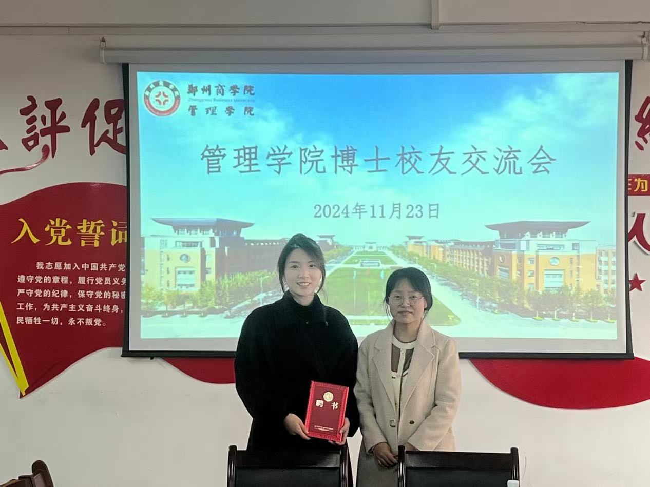 会上,博士校友发言,回忆起往昔在校园里的求学时光,感慨万千。赵晓园博士分享了自己在学术道路上披荆斩棘的历程,从最初确定研究方向时的迷茫,到后来坚持不懈深入钻研,最终在专业领域取得重要成果。最后,我院李晓翠院长为赵晓园颁发“校友导师”聘书,并合影留念。