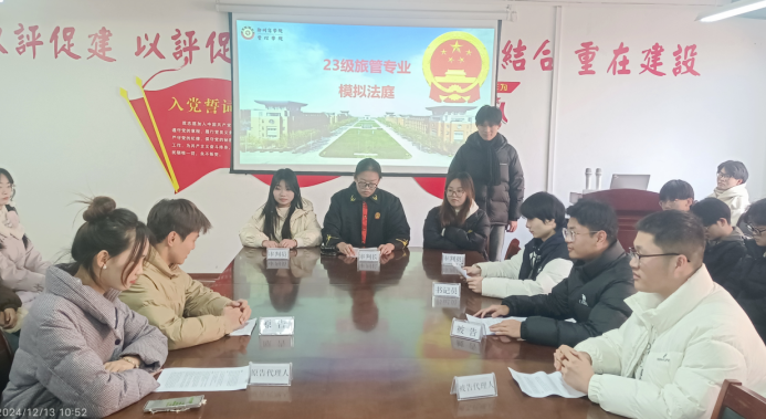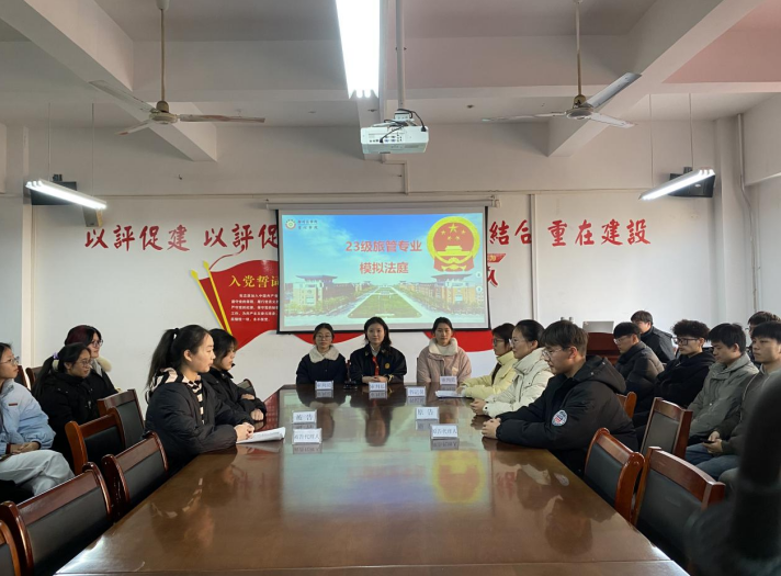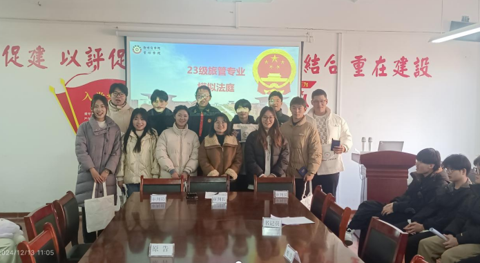 为了有效地践行OBE教育理念,使《旅游法规》教学内容更加生动、直观,加深学生对法律知识的理解和应用,我院旅管专业组织2023级专业学生开展模拟法庭活动。12月13日上午,管理学院院长李晓翠、教研室主任王彦青、任焕琴教授、任课教师李国谨、教研室其他老师以及2023级学生出席了此次活动。