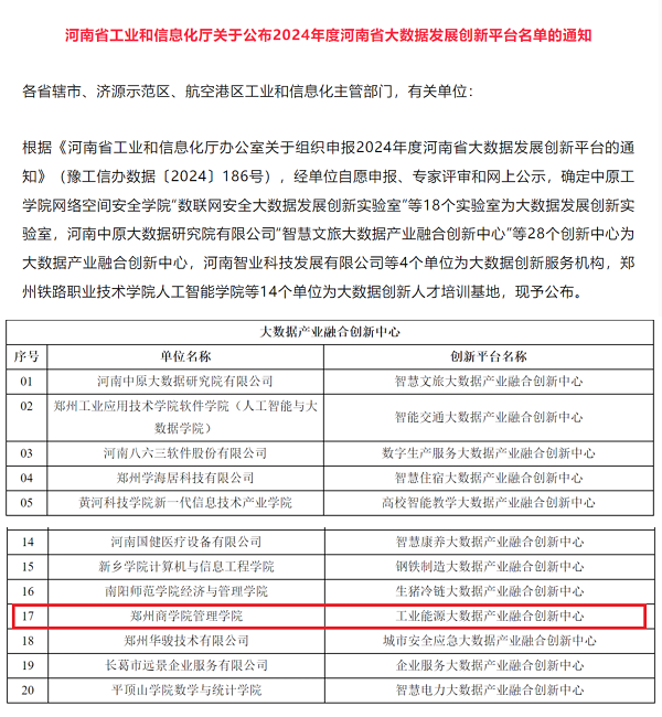 近日,河南省工业和信息化厅发布《2024年度河南省大数据发展创新平台入选名单公示》,我院李晓翠院长主持申报的“工业能源大数据产业融合创新中心”成功入选河南省“大数据产业融合创新中心”。