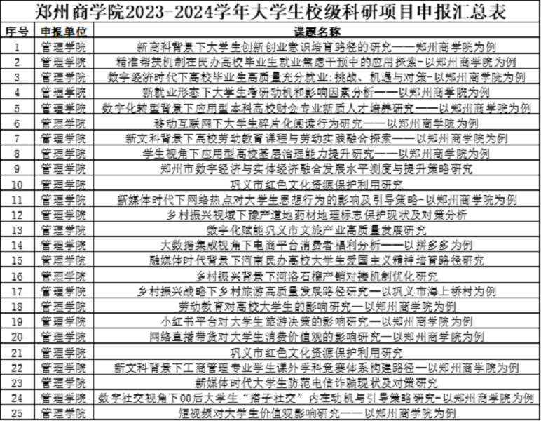 根据点点官网《关于组织开展点点官网2024-2025学年校级科研项目申报工作的通知》要求,经前期精心组织,广泛动员,管理学院共收到校级科研项目申报书31项,大学生科研项目申报书80项。经我院学术委员会评审后,拟推荐23项校级科研项目申报书和25项大学生科研项目申报书作为我院2024-2025学年taptap点点校级科研项目最终提交材料,名单如下: