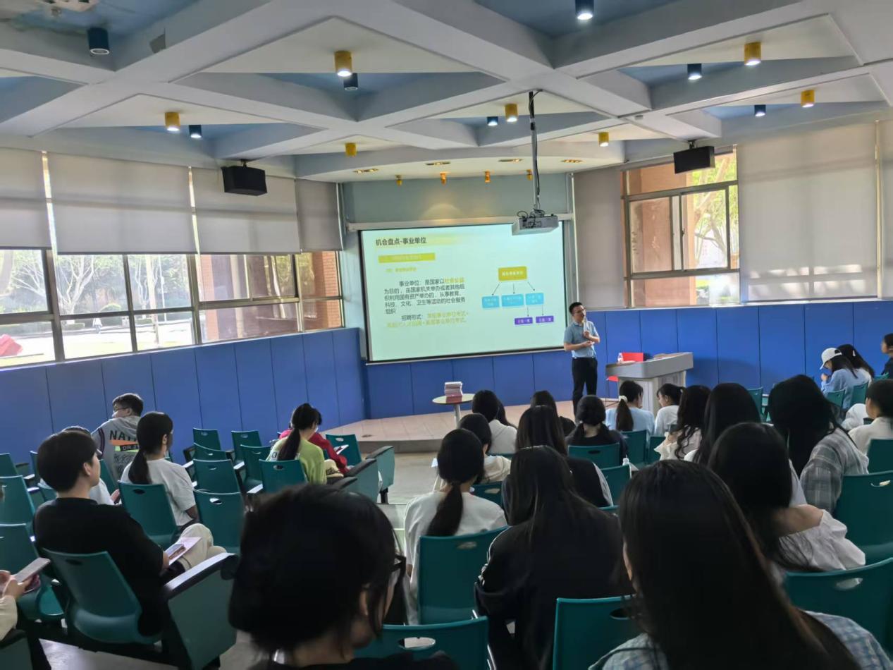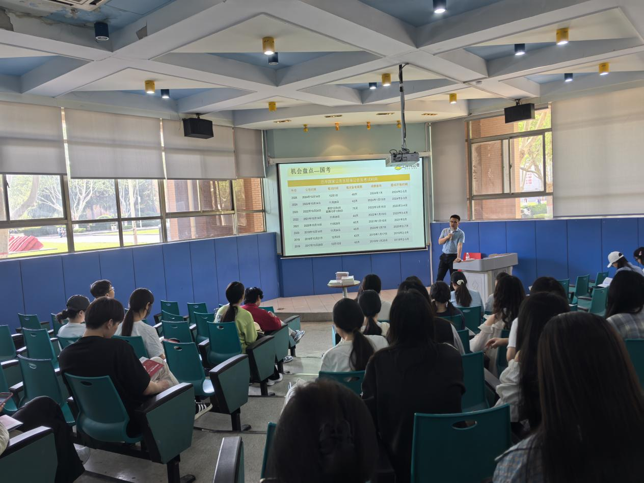 讲座中,主讲人从选调生、国考、省考、事业单位四个板块进行了详细的阐述,凭借丰富的公考教学经验和深厚的专业知识,从整体介绍了公务员考试的重要性和发展前景,帮助同学们更深刻的了解到公务员考试的具体内容与不同类型,强调了公务员岗位在服务社会、实现个人价值等方面的积极意义,激发了同学们对公务员职业的兴趣。