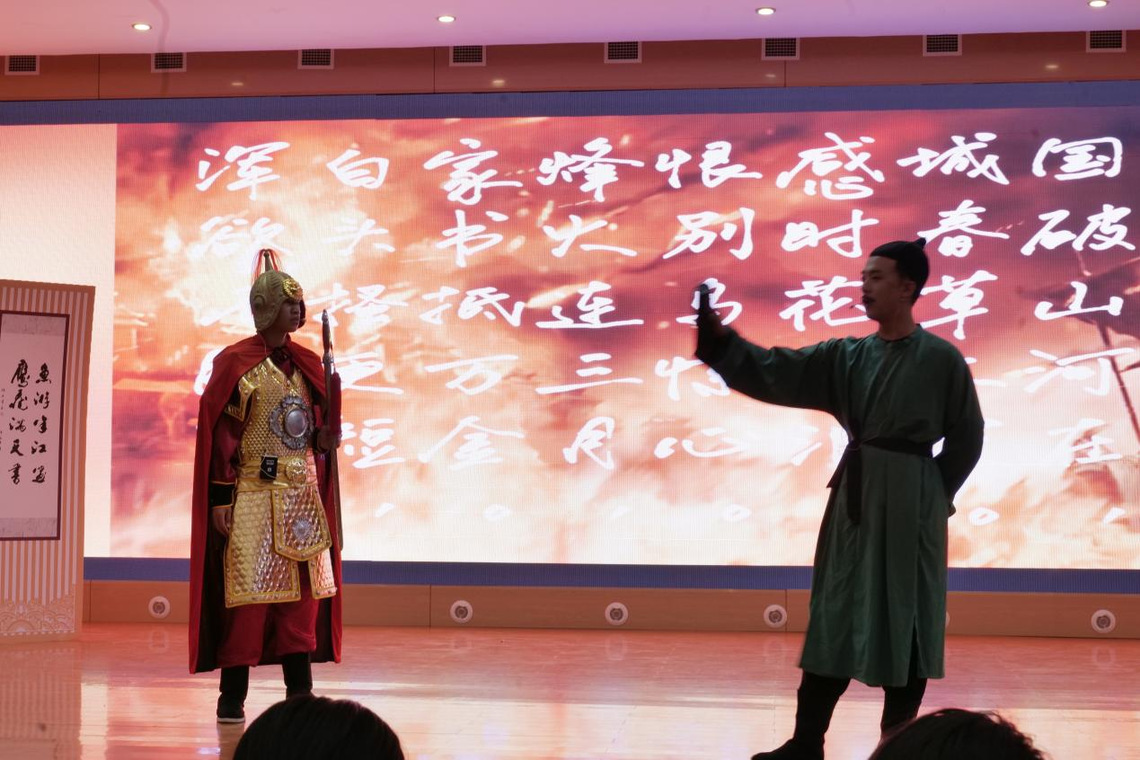 随后我院团体赛登场,我院以三幕式情景剧结构重构诗圣传奇,从青年仗剑游历的裘马清狂,到壮年颠沛吟哦的沉郁顿挫,终至暮年孤舟飘零的苍凉浑茫,将安史之乱的血火烽烟与马嵬坡变的帝国黄昏,熔铸成跌宕起伏的戏剧骨骼,凿刻出诗人精神的当代转译,更在现场穹顶下激荡出跨越千年的精神回响。