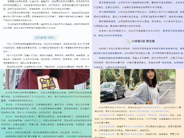 我院以立德树人为根本,将礼仪教育贯穿人才培养全过程,以促进学生全面发展为导向,把礼仪教育纳入人才培养全过程。为进一步培养学生的文明礼仪意识,引导学生养成良好的行为习惯,共同营造和谐美好的校园环境,我院进行了以下重点工作:一是做好基础引导,开展主题班会。3月16日,我院举办了以“习礼仪之风,塑校园新貌”为主题的礼仪教育主题班会。围绕校园礼仪规范、餐厅礼仪规范和课堂礼仪规范等内容,向学生阐述了文明礼仪的重要意义。在班会后,各个班级分别签署了《校园文明礼仪倡议书》,进一步巩固了礼仪教育的成果。二是利用线上媒体,开设特色栏目。为了让学生更加深刻地感受到礼仪教育的重要意义,利用我院公众号开设了“青仪课堂”栏目,此栏目邀请了优秀学生代表分享在校期间礼仪教育所带来的实践体悟以及个人的成长案例,辅以日常礼仪指南专题推送,切实培养温文尔雅、其行如仪的郑商学子。
