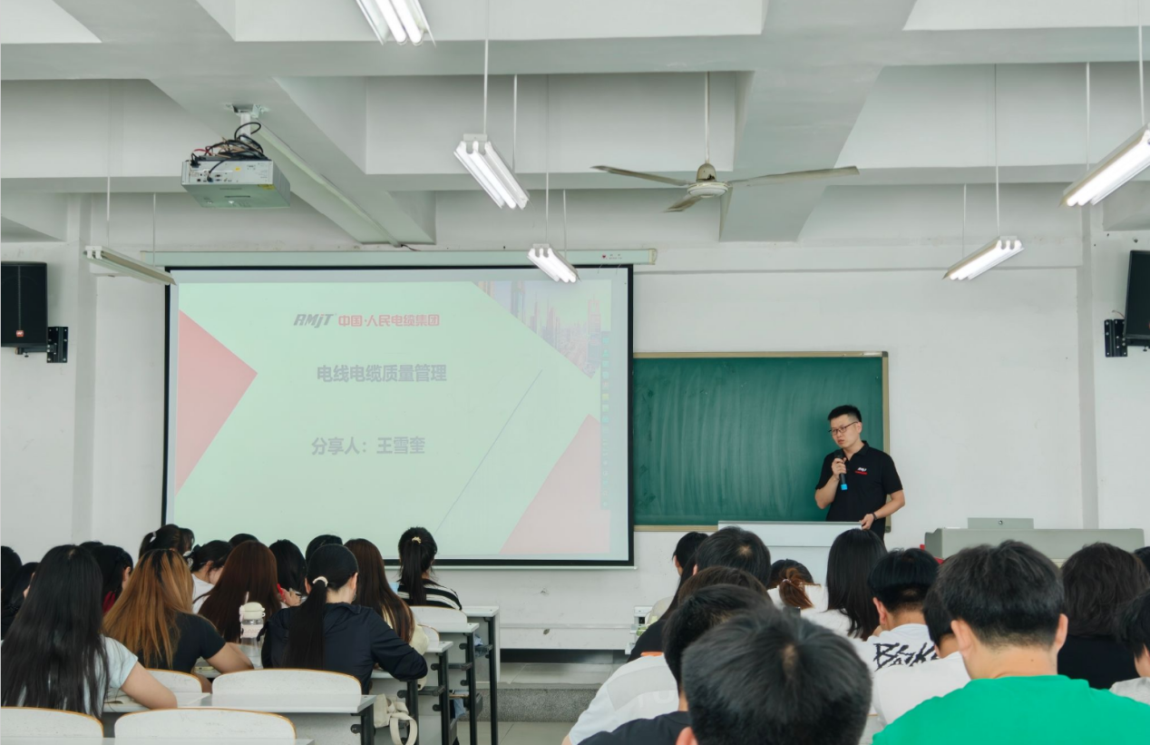 巩义市人民电缆集团有限公司质量部经理王雪奎进行《质量管理学》课程的授课,王雪奎经理以人民电缆集团的质量管理体系为案例,系统讲解了人民电缆集团的产品品类、质量管理系统和质量监督管理体系,结合企业实际运营情况中的“人机料法环”五大环节,深入剖析了质量管理体系在企业中的构建与实施要点。他指出,一套完善的质量管理体系不仅是企业规范运营的保障,更是提升企业竞争力的关键因素。