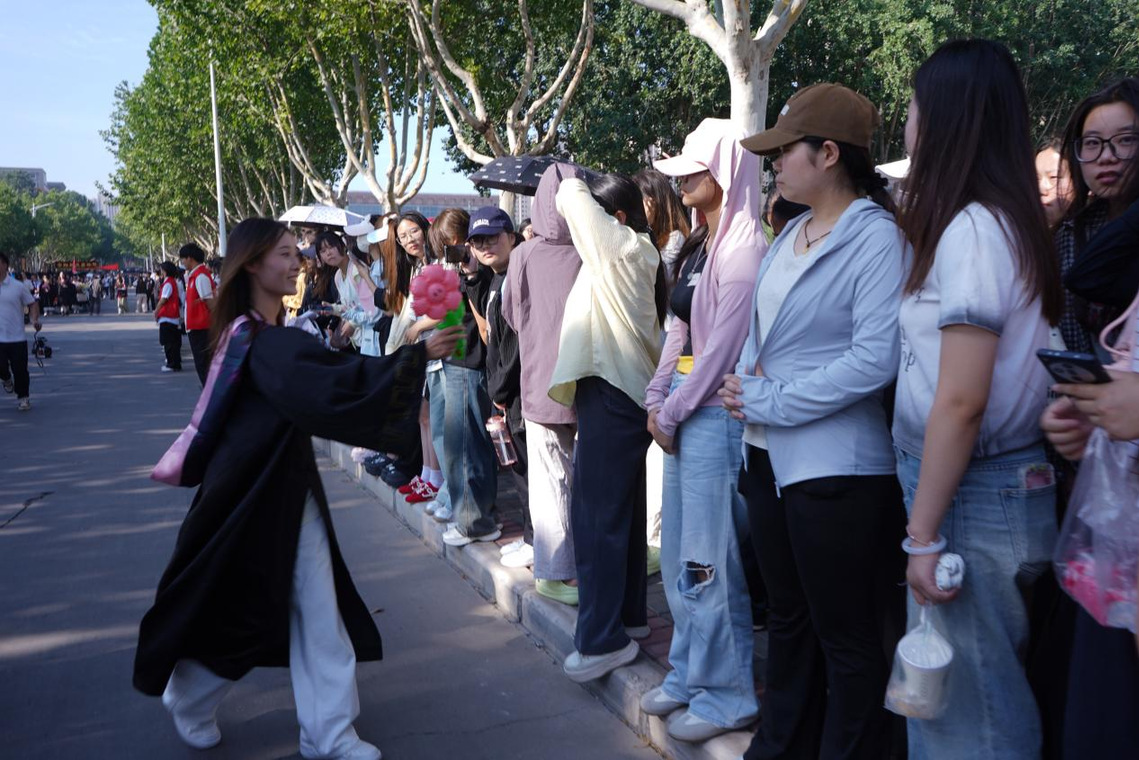 学弟学妹们高举缤纷的祝福标语、手卡、鲜花、礼物,热情地站在巡礼路段两侧,用灿烂的笑容和欢呼声为学长学姐们送上美好祝愿;毕业生们与师长、同窗们挥手告别,再次行走在熟悉的校园里,感受着母校带来的温暖。