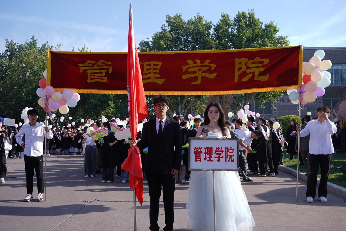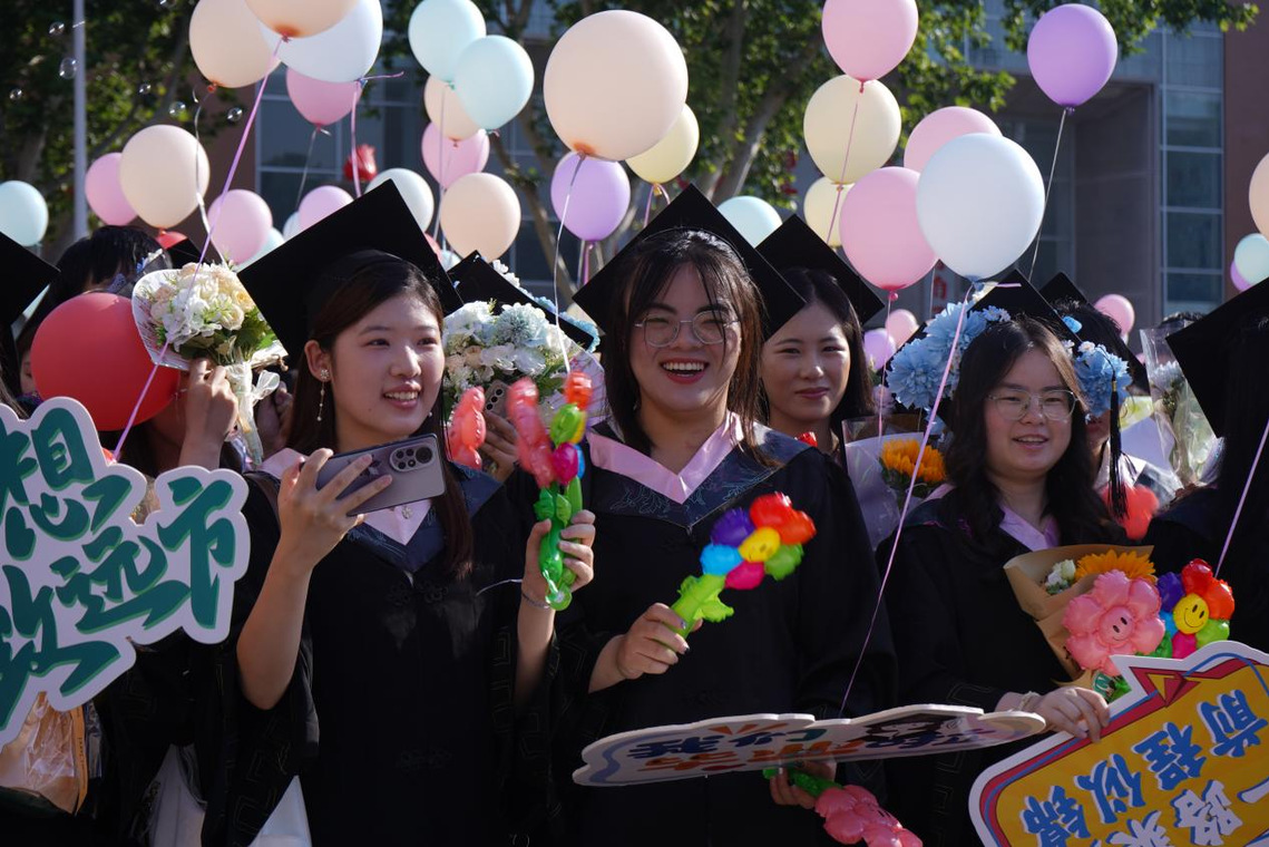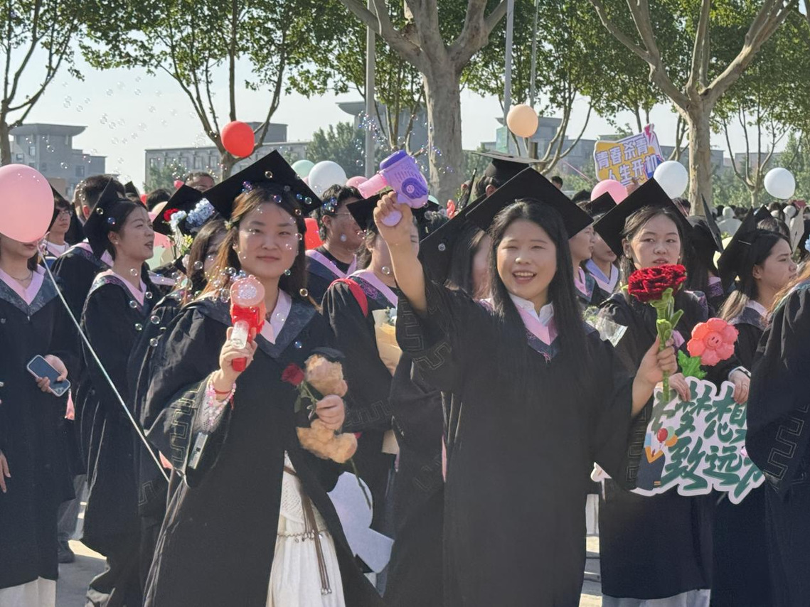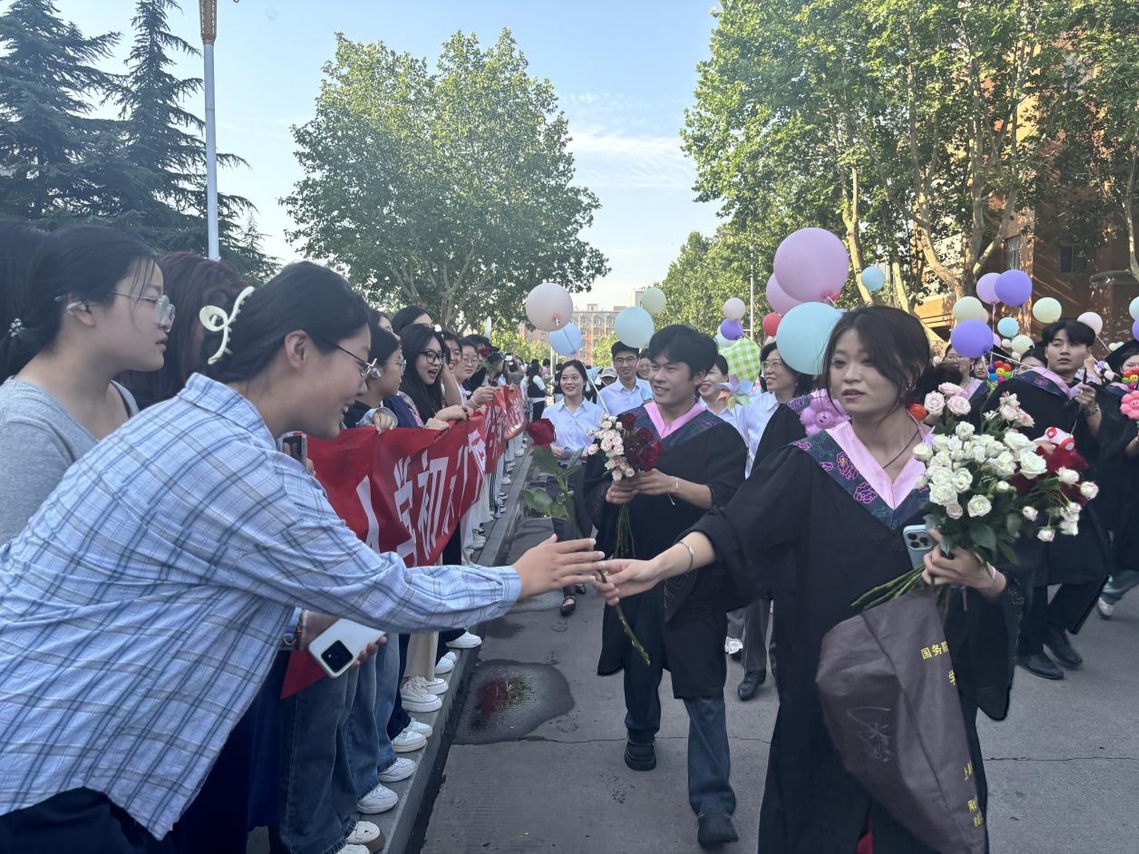 6月6日,承载着师生祝福、洋溢青春气息的毕业生校园巡礼拉开帷幕。我院毕业生在院牌院旗的引领下,在李晓翠院长、宋森书记、张卫丽副院长带领下走向成功大道,学子们并肩而行,身着柔美的蜜桃粉学士服,在日光下汇聚成一片梦幻绚丽的花海,轻盈的衣袂随风摇曳,勾勒出毕业季最动人的画卷。