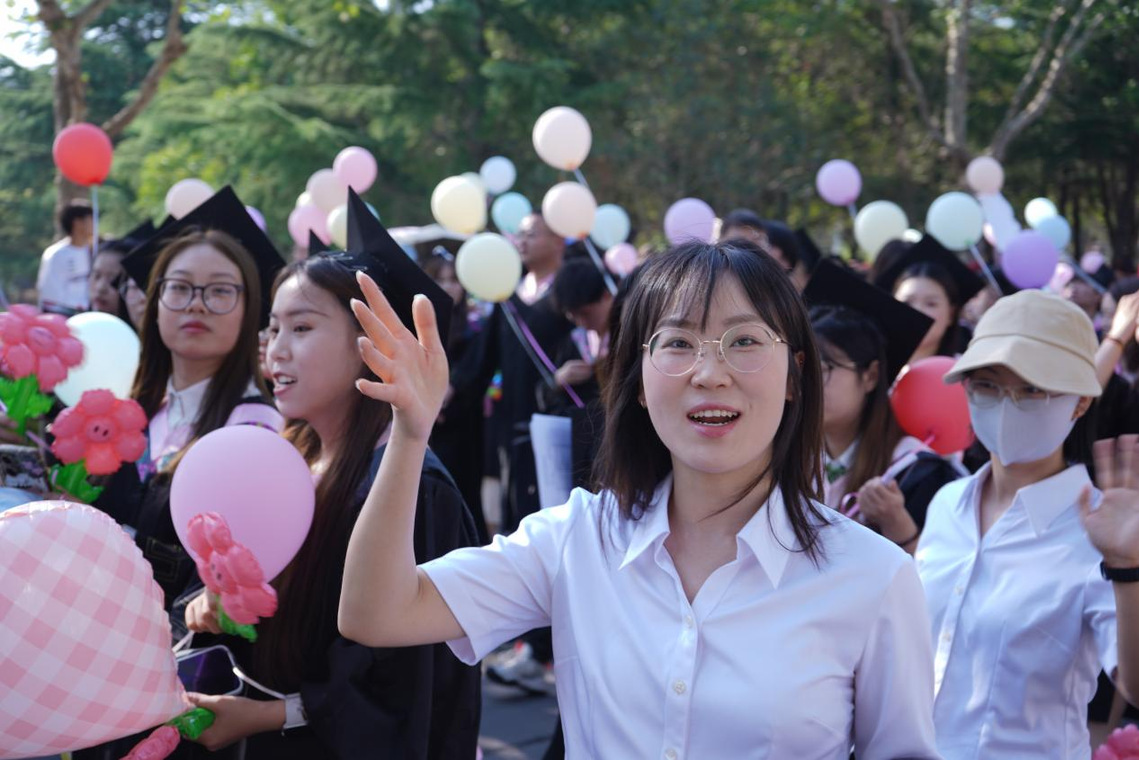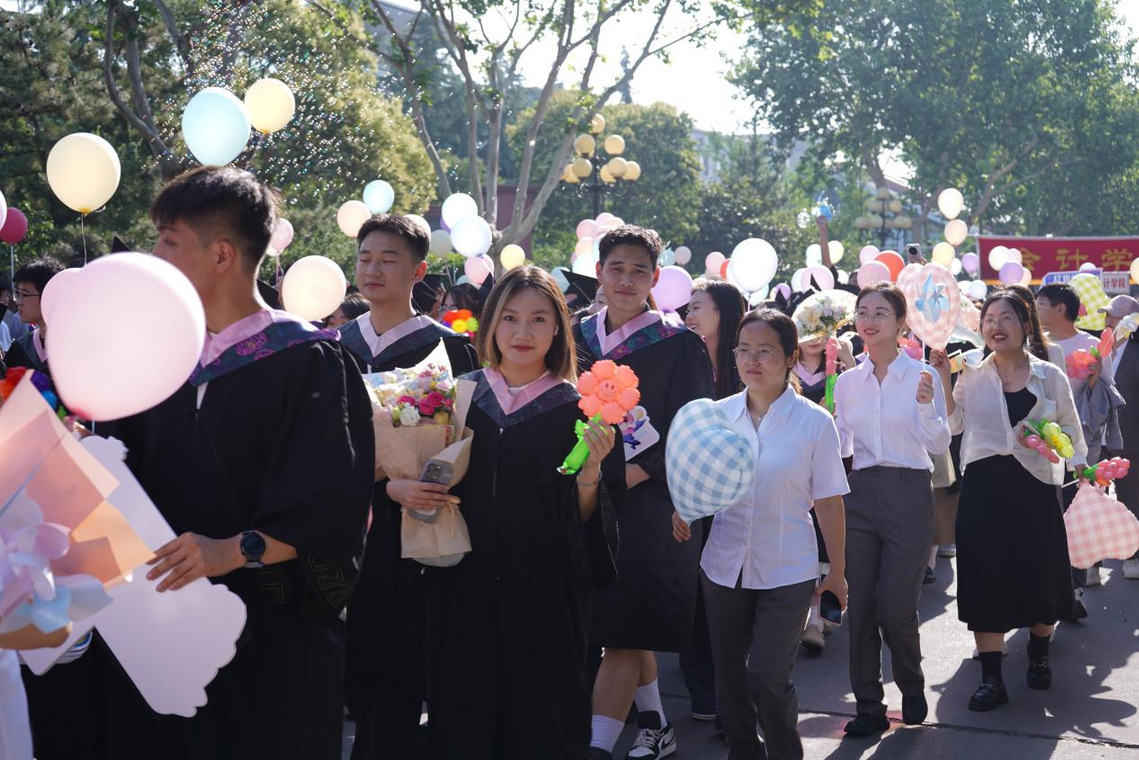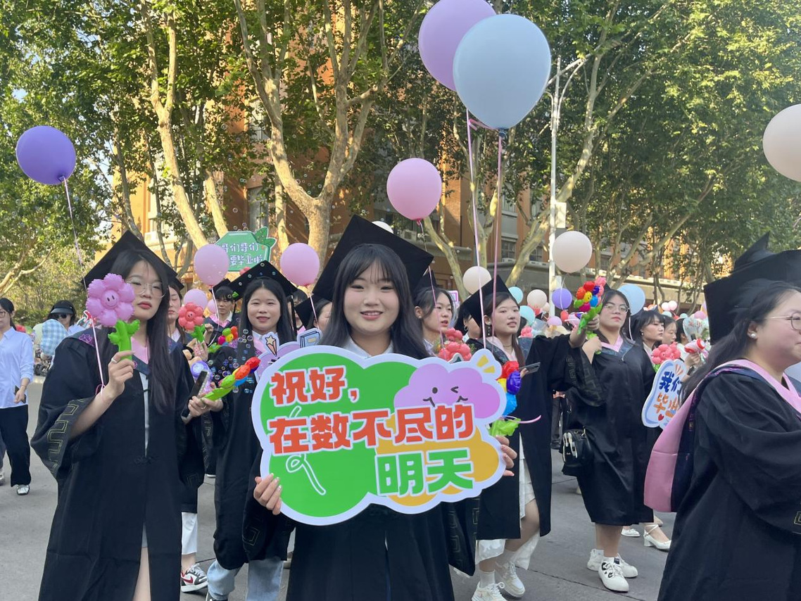教师方阵、考研学生成功上岸方阵、优秀毕业生代表方阵从成功大道出发,依次前进。教师们手持风车和花朵气球环绕在毕业生方阵外围,代表着对毕业生“前途似锦,一路生花”的美好祝愿;考研上岸的同学手持标明上岸学校的KT板及气球。祝愿此去繁华似锦,归来仍是少年。