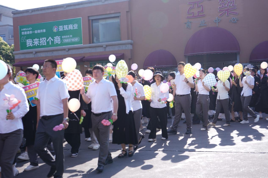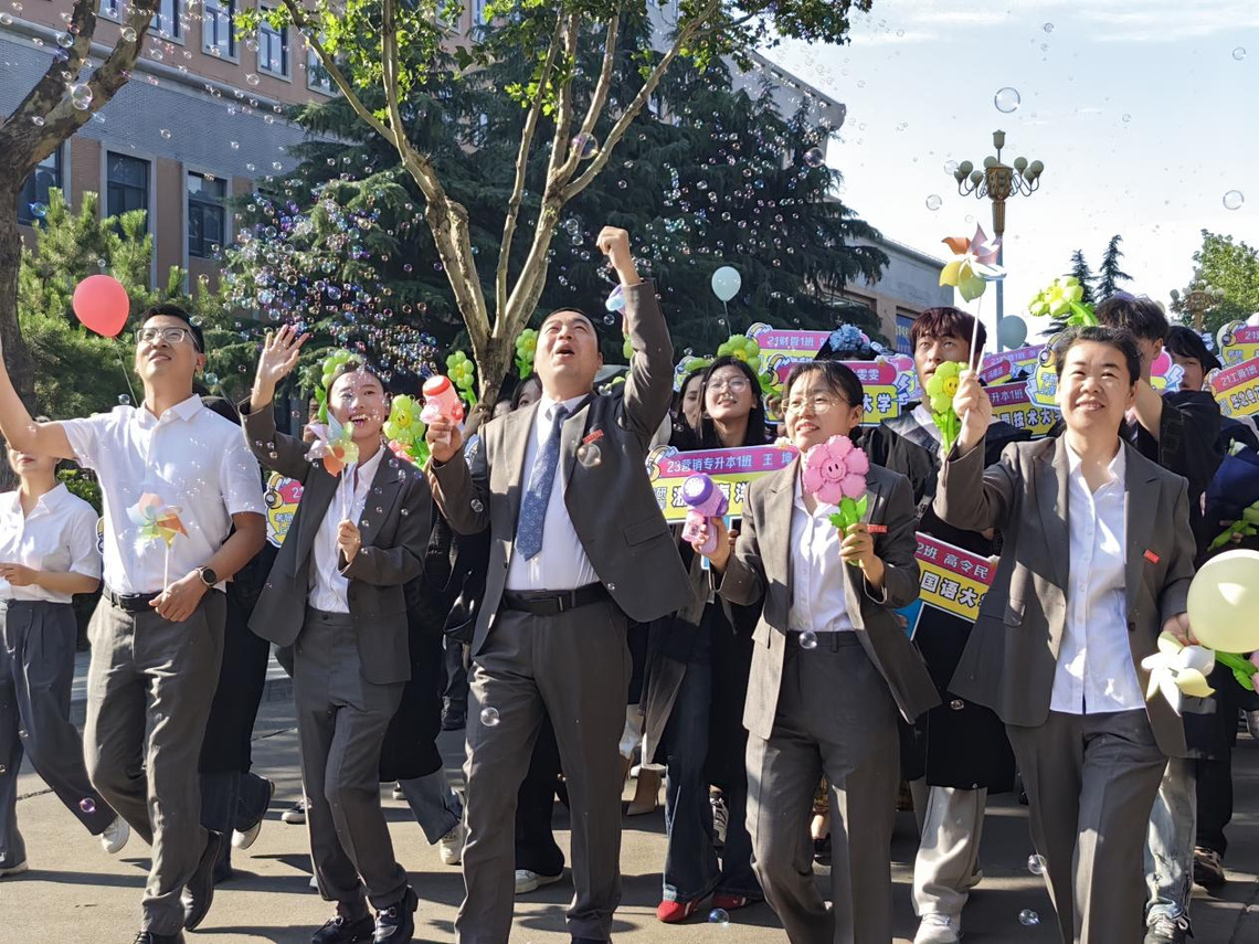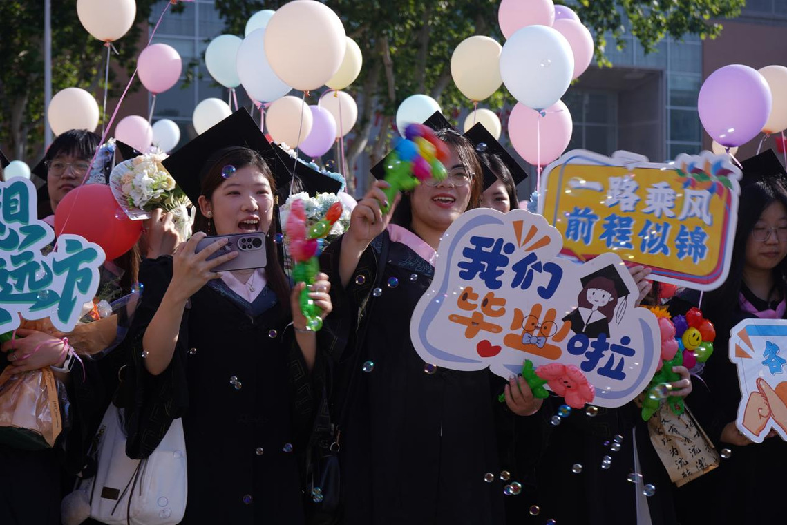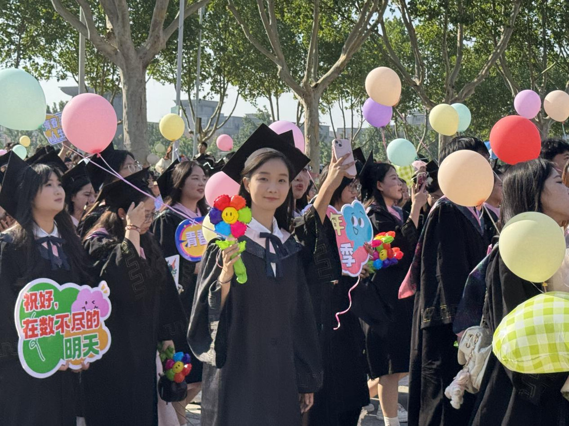 教师方阵、考研学生成功上岸方阵、优秀毕业生代表方阵从成功大道出发,依次前进。教师们手持风车和花朵气球环绕在毕业生方阵外围,代表着对毕业生“前途似锦,一路生花”的美好祝愿;考研上岸的同学手持标明上岸学校的KT板及气球。祝愿此去繁华似锦,归来仍是少年。