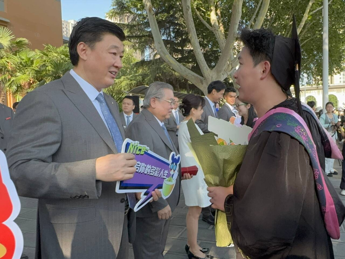 毕业生代表身着华丽的礼服,在阳光下熠熠生辉,前往行政楼与校领导和现场同学进行互动,现场气氛再一次被点燃。