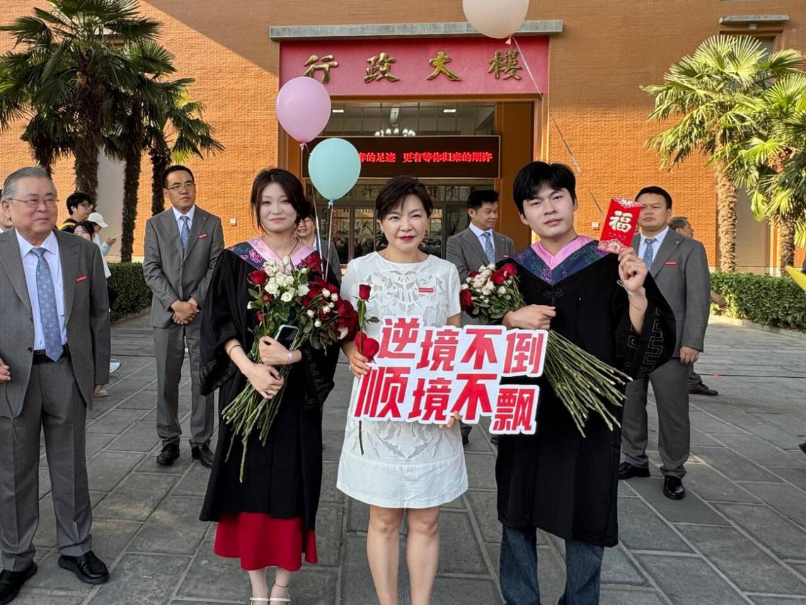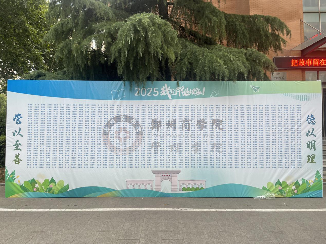 学院门口放置以我院全体毕业生姓名组成的喷绘;电子屏播出“祝2025届毕业生前程似锦”“把故事留在郑商,把归途写成眷恋”“此去山高水长,郑商永远是你温暖的港湾”等标语;KT板上“未来可期”“挥手青春,拥抱未来”“毕业快乐”等祝愿营造出毕业季青春洋溢的美好氛围。