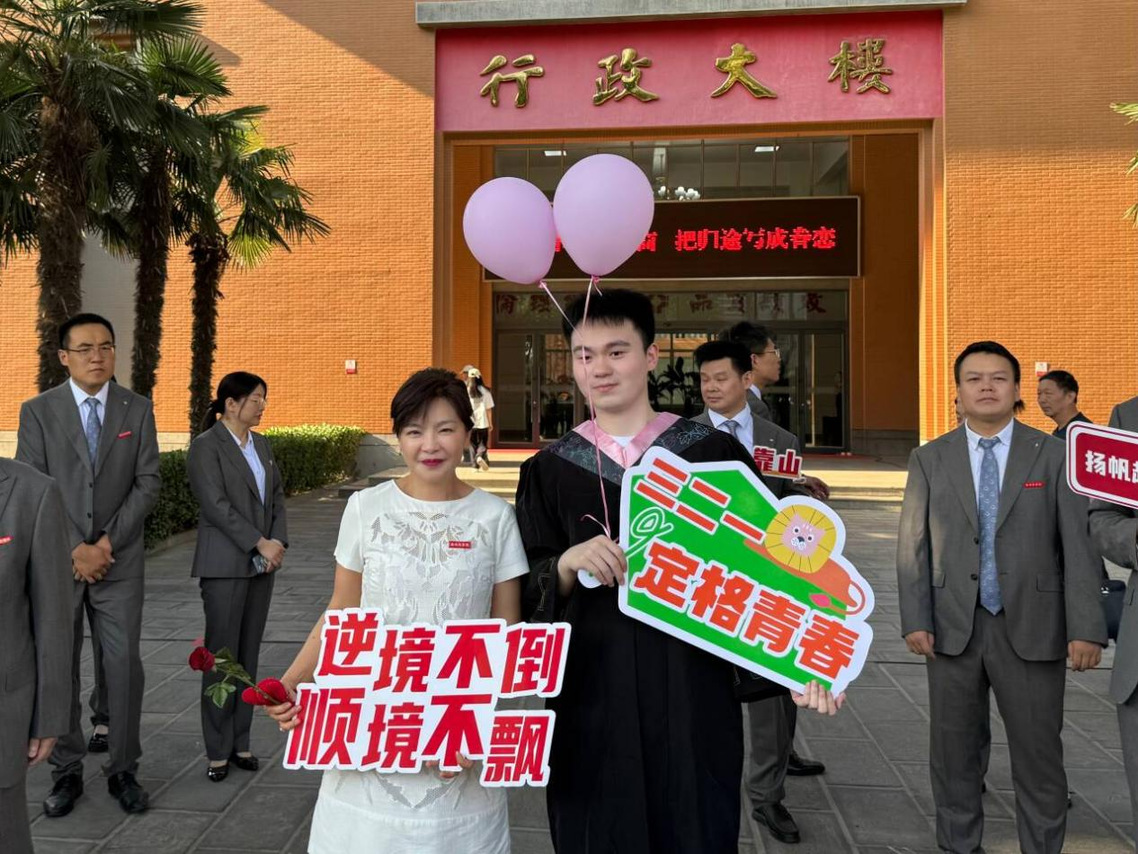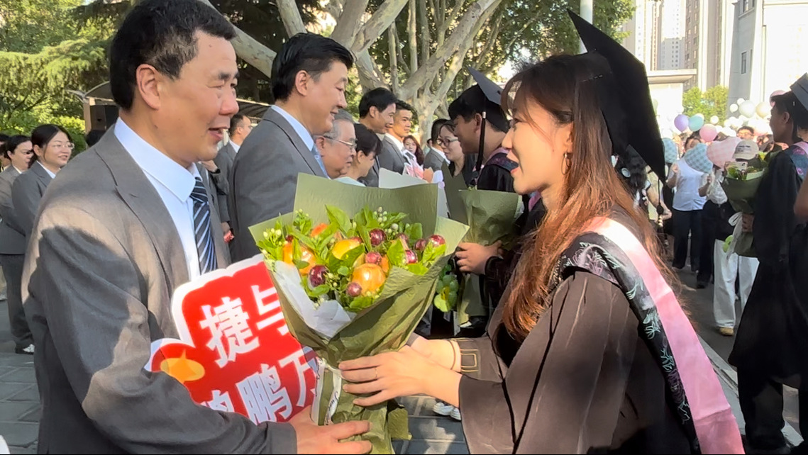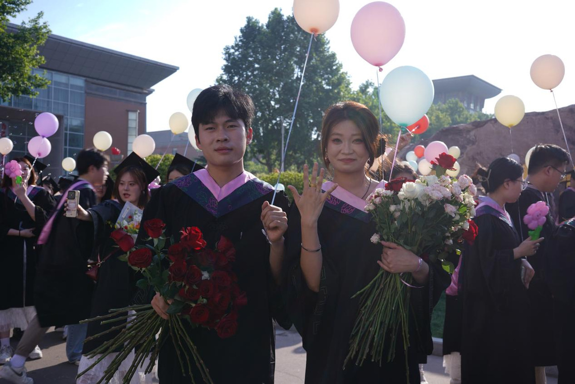 一对身着学士服,手捧红玫瑰的两位新人成为全场焦点。管理学院毕业生杨志豪和赵青燕——这对在郑商校园相遇、相知、相爱的恋人,选择在毕业这个重要时刻,用最浪漫的方式向母校致谢。