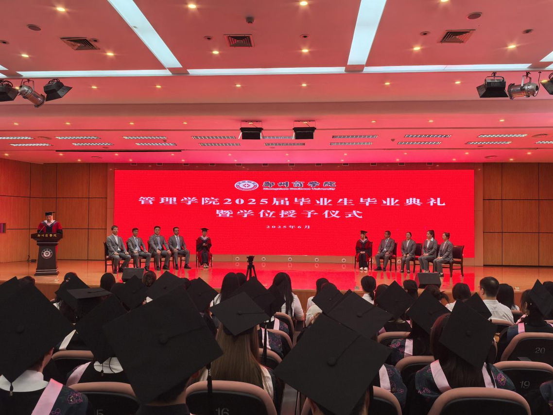6月5日,我院举办毕业典礼暨学位授予仪式。毕业生身披象征学术与成长的学士服,黑袍如墨,衬里以学院专属色彩,帽檐垂落的流苏随风轻摆。随着庄严的乐曲声,毕业生们依次登台,李晓翠院长为每位毕业生拨穗正冠,将帽檐的流苏从右侧拨至左侧,象征着学子们圆满完成学业,即将开启人生新篇章。
