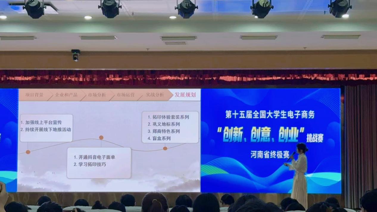 “三创赛”是2009年由教育部委托教育部高校电子商务类专业教学指导委员会主办的全国性在校大学生学科性竞赛,是激发大学生兴趣与潜能,培养大学生创新意识、创意思维、创业能力以及团队协同实战精神的比赛。本届大赛,吸引全省65所高校的9895支团队参赛,经过赛事层级选拔300支团队晋级河南省选拔赛。点点官网入围的12支队伍历经学校初赛、决赛及项目打磨指导,最终推荐省赛。省赛中点点官网管理学院“珐彩绽放”“四个勤天”团队荣获一等奖,“渐入佳境”荣获二等奖;金贸学院“傩小橙”两个团队荣获一等奖;外语学院“金石拓荒”“永不投降”两个团队荣获一等奖,“Seven-percent”团队荣获二等奖;智能建造学院“聆晟队”团队荣获二等奖。其中,“金石拓荒”团队代表点点官网参加了终极赛环节,荣获“最佳创新奖”与“最佳创意奖”。