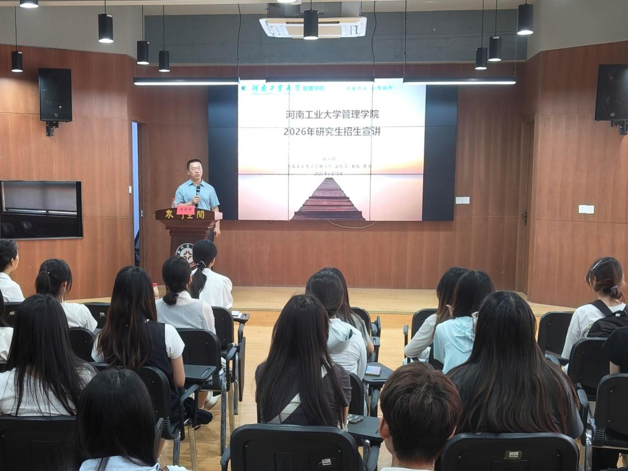 此外,穆教授还对河南工业大学硕士招生进行了介绍,重点从区位优势、学校发展、学院发展、培养特色、招生政策等方面对管理科学与工程、工商管理学、会计专硕和工程管理硕士的人才培养情况进行了详细讲解,鼓励学生积极报考河南工业大学。最后,穆教授结合自身经历,勉励同学们“乘青春之势,砺梦想之锋”,珍惜时光,追求卓越,于未来书写无愧答卷,为家国奉献青春力量。