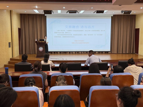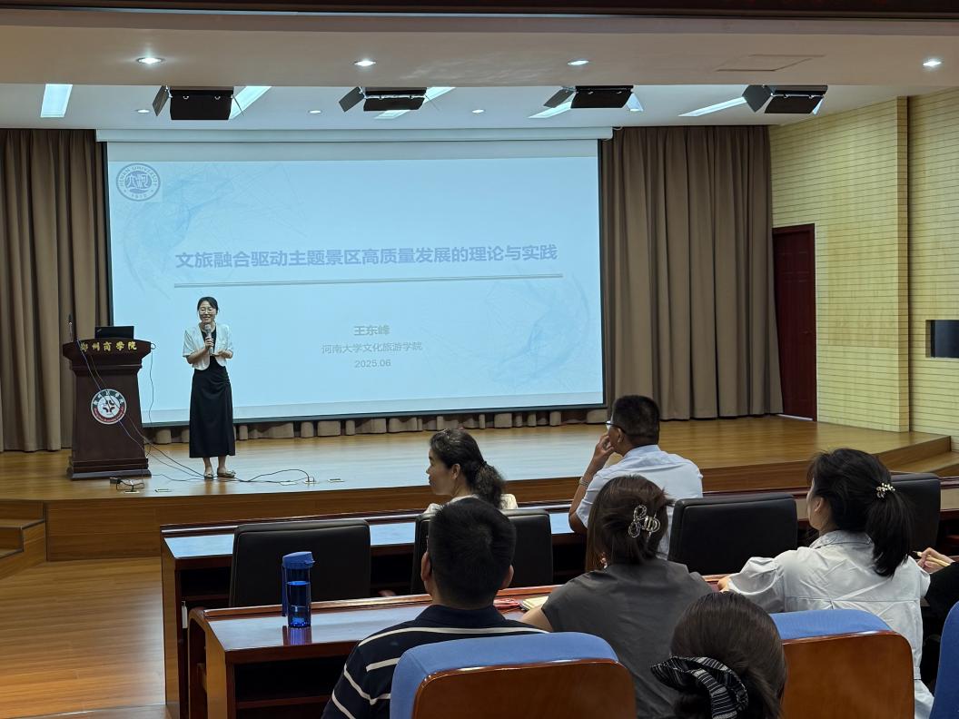 为深化旅游管理专业学科建设,提升师生学术素养,6月18日,我院在图书馆五楼学术报告厅成功举办“文旅融合驱动主题景区高质量发展的理论与实践”专题学术报告会。本次报告会特邀河南大学文化旅游学院副院长、知名旅游管理专家王东峰教授担任主讲嘉宾,为在场师生呈现了一场兼具理论深度与实践价值的学术盛宴。出席本次报告会的有我院李晓翠院长、张卫丽副院长、旅游管理教研室全体无课教师及22级旅游管理专业的同学们,现场气氛热烈,学术氛围浓厚。