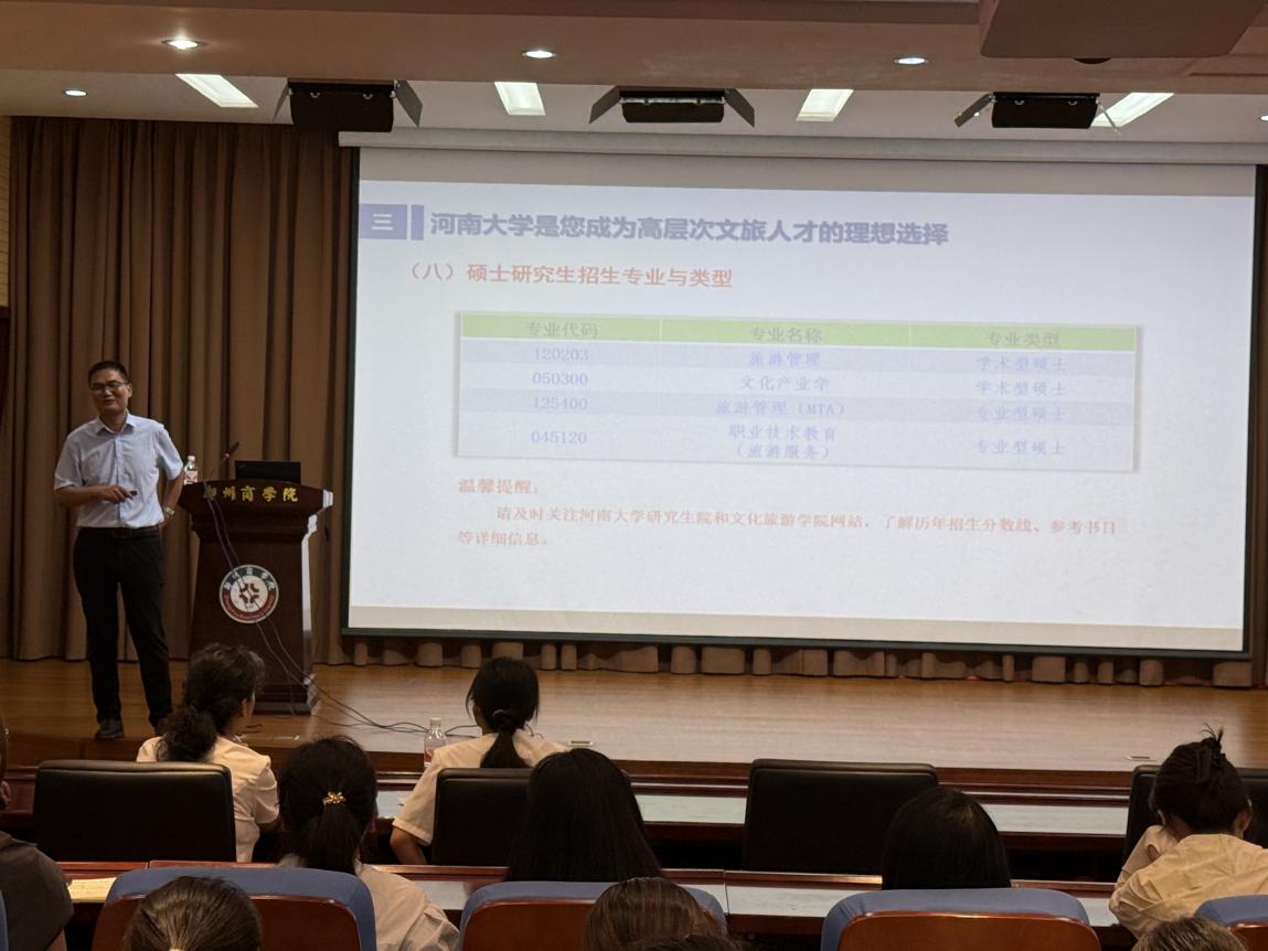 王院长通过理论阐述与实践案例结合,生动展示了文旅融合在主题景区中的应用成效,重点分析了“只有河南·戏剧幻城”、“清明上河园”等河南成功案例,解析其如何将历史文化、民俗与自然景观融入景区规划运营,打造独特品牌价值,案例分享为师生提供了直观的文旅融合实践参考。此外,王院长向在座的同学发出邀请,欢迎各位优秀学子报考旅游管理类研究生专业,并对各专业进行了详细讲解,现场互动热烈,反响积极。