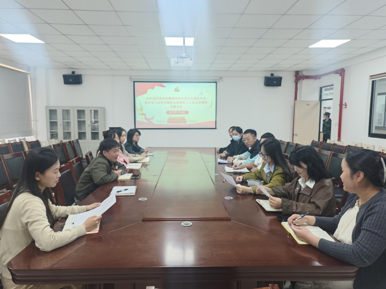 为深入贯彻落实2025-2026学年第一学期全体教职工大会上校领导讲话精神,明确新学期工作方向,凝聚发展共识,我院分阶段、分层次开展 “自主学习、校领导驻会导学、全院共学凝共识” 三个系列专题会议,推动讲话精神落地生根。