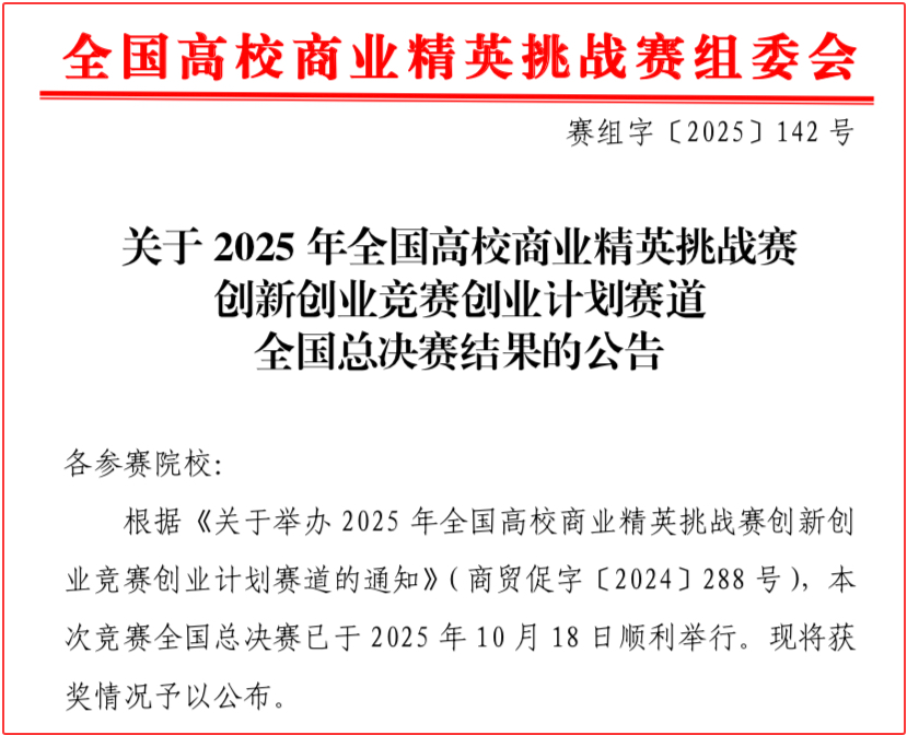 近日,由中国贸促会商业行业委员会、中国国际商会商业行业商会、中国商业经济学会共同主办的2025年全国高校商业精英挑战赛创新创业竞赛创业计划赛道全国总决赛圆满落幕。本届竞赛共有来自全国各地31个省、自治区、直辖市的600余所高等院校报名参赛。经过知识赛、校赛、全国预选赛、全国总决赛的激烈角逐,我院由工商管理、市场营销、大数据管理与应用专业学生组成的三支代表队,在指导老师张玲燕、陈茜、吴阳阳的带领下,取得全国总决赛二等奖2项、三等奖1项的优异成绩。