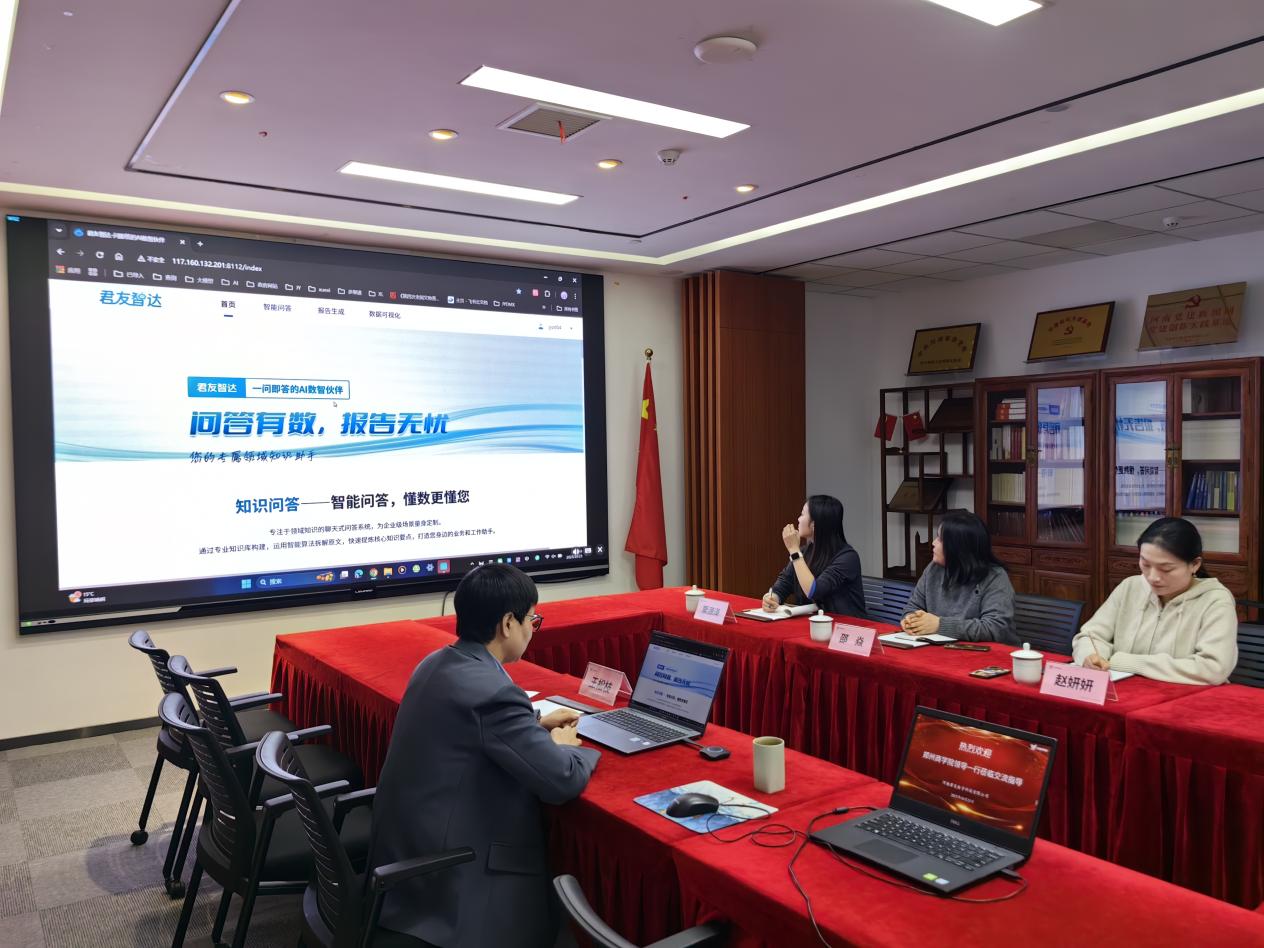 座谈会上,河南君友数字科技有限公司事业部总经理王松枝首先向调研组成员详细介绍了公司发展历程、业务架构以及数字化转型方面的实践成果,并展示了其在数据处理服务、信息技术咨询和人工智能公共数据平台等领域的核心业务。其中,王经理重点介绍并演示了其创新产品“君友智达”人工智能平台的操作流程,并分享了该平台在开发过程中的管理经验和挑战。