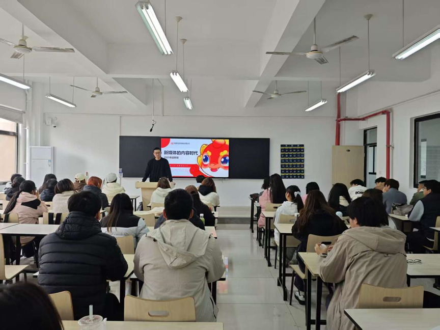 可云总监作专题报告就新媒体的内容时代做了分享,结合抖音平台生态变迁展开深度分析。他指出,近年来抖音内容从泛娱乐化向垂直领域深化,用户群体由年轻群体扩展至全年龄段,内容创作与消费逻辑均发生显著变化。结合行业案例,他深入剖析了数据驱动精准营销等新技术对传统营销模式的颠覆,并鼓励学生“做既懂算法又懂人心的复合型营销人才”。