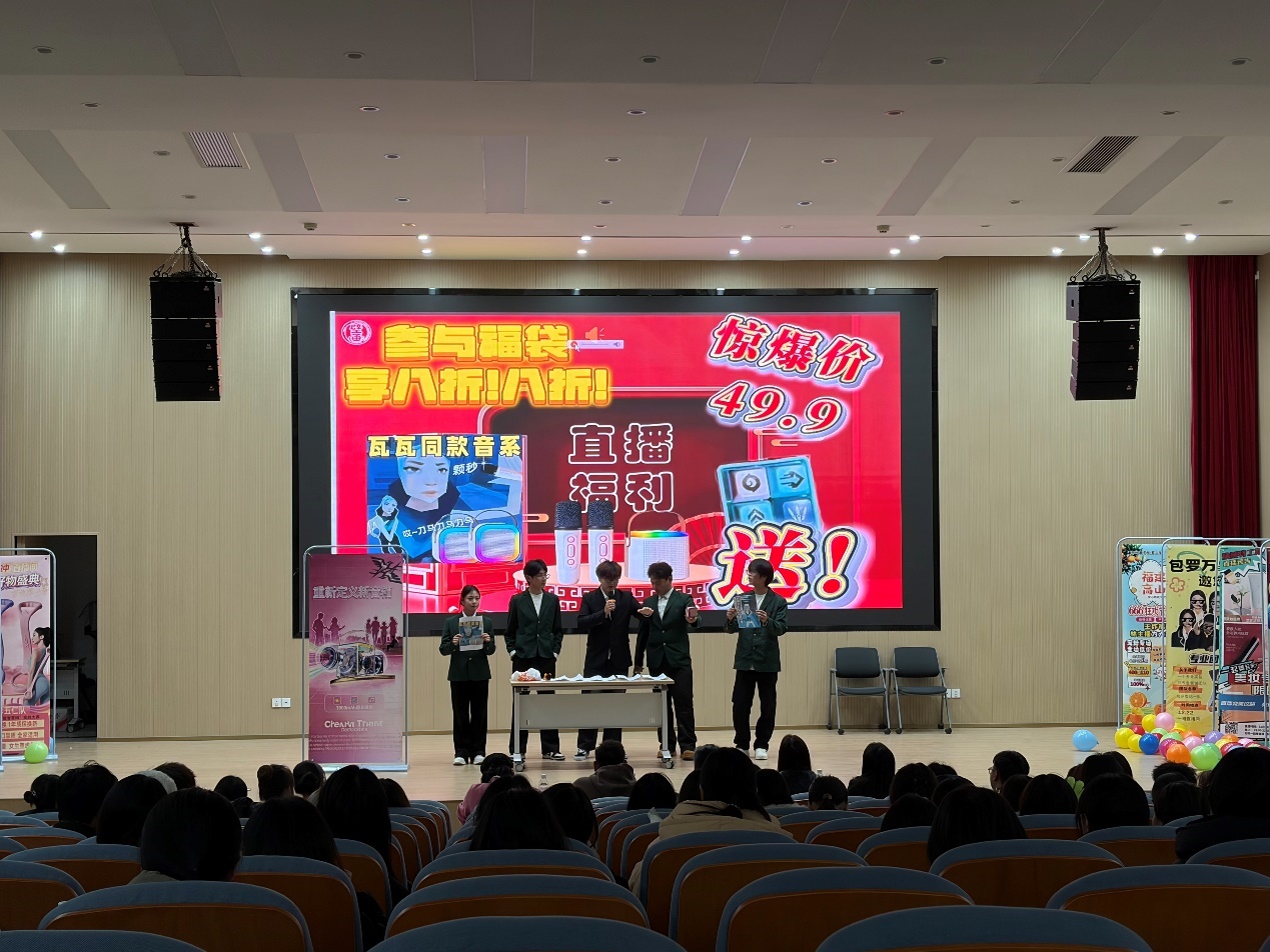 本次决赛以“智驭数海,营销出彩”为主题,8支晋级队伍依次登台,以模拟直播带货形式完成产品推介。各队伍精心筹备,通过PPT演示、视频展播、歌舞演绎、实物体验及观众互动等多元形式,展示了暖宝宝、美妆、箱包、弹力带、农产品、电子产品等丰富商品,现场氛围热烈,掌声欢呼声不断。五位评委秉持公平公正原则,从直播表现、产品介绍、创新创意、现场效果等维度进行打分,保障赛事严谨有序。